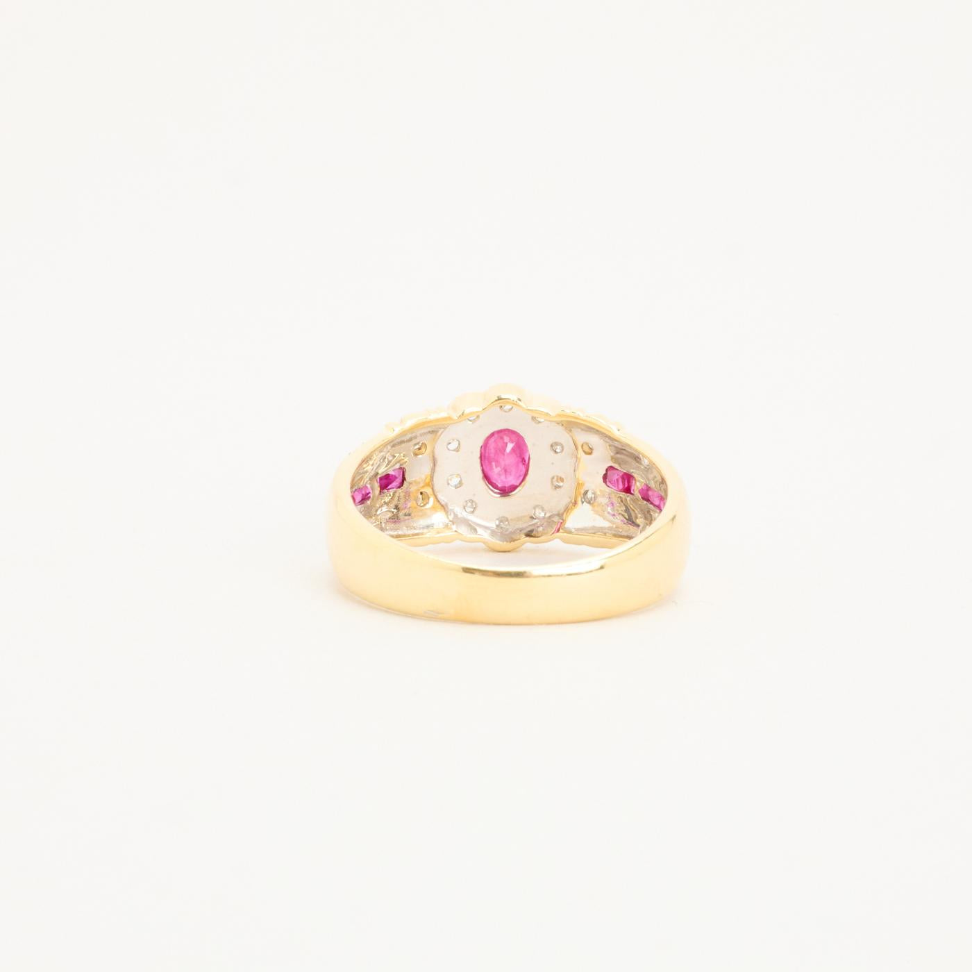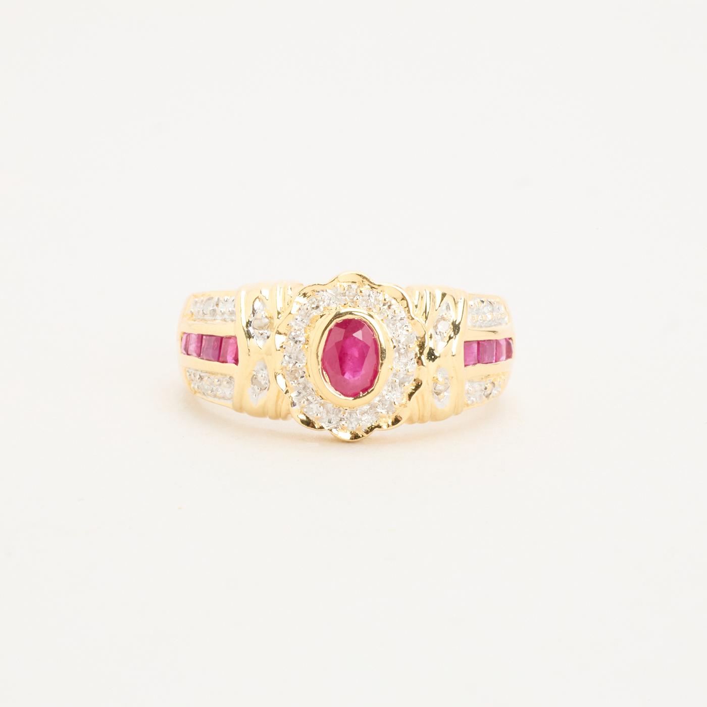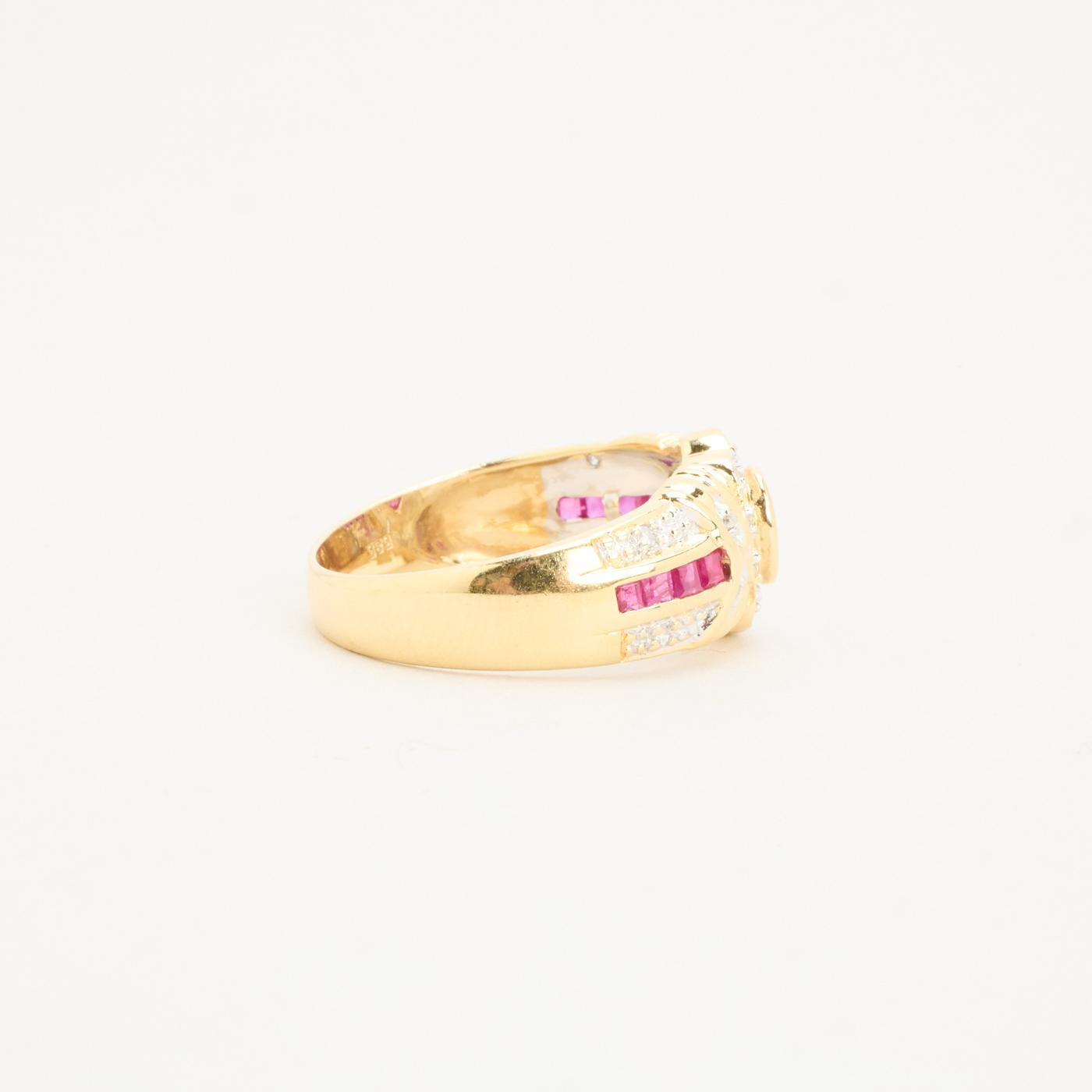 Gypsyring med diamant (0.15 ct) i 14K guld og hvidguld med rød sten, str. 57, 4.96 g