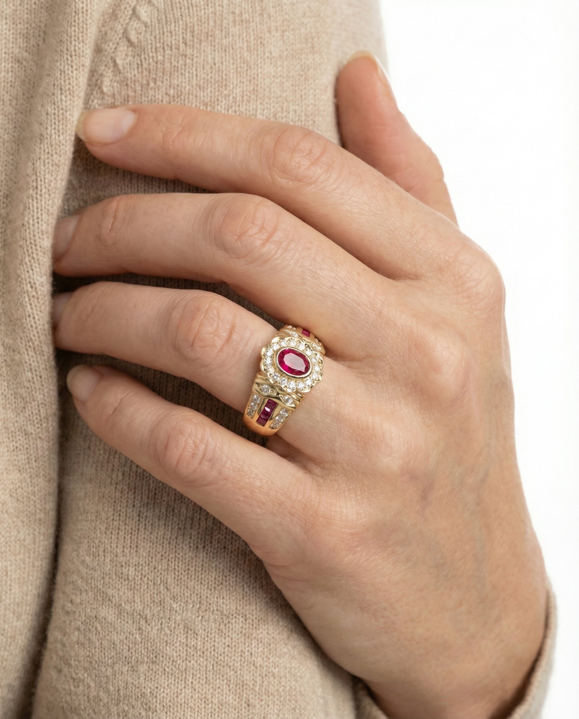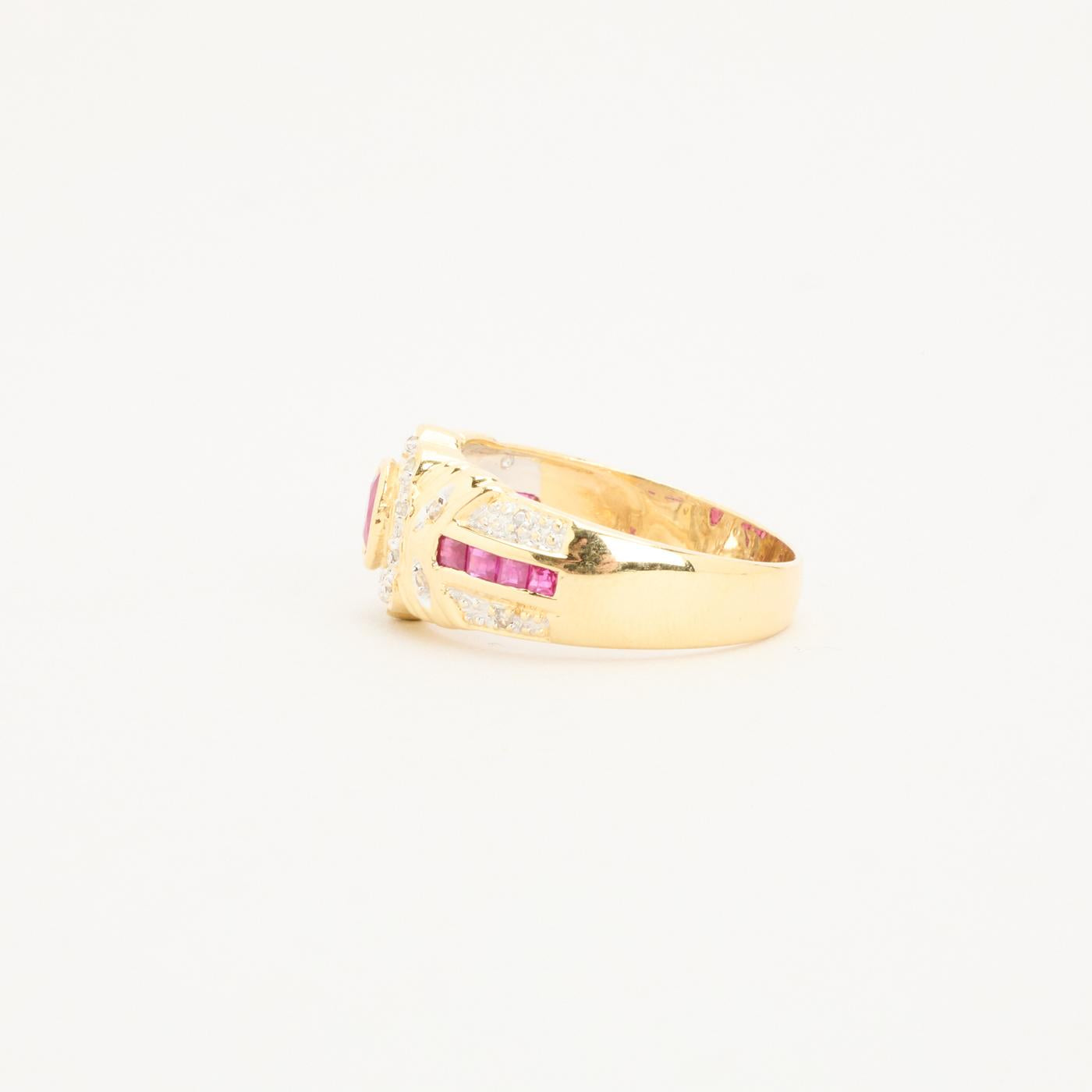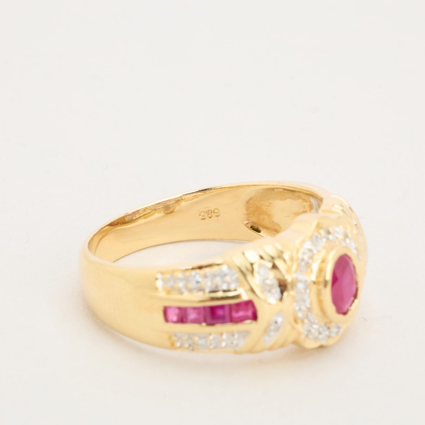 Gypsyring med diamant (0.15 ct) i 14K guld og hvidguld med rød sten, str. 57, 4.96 g
