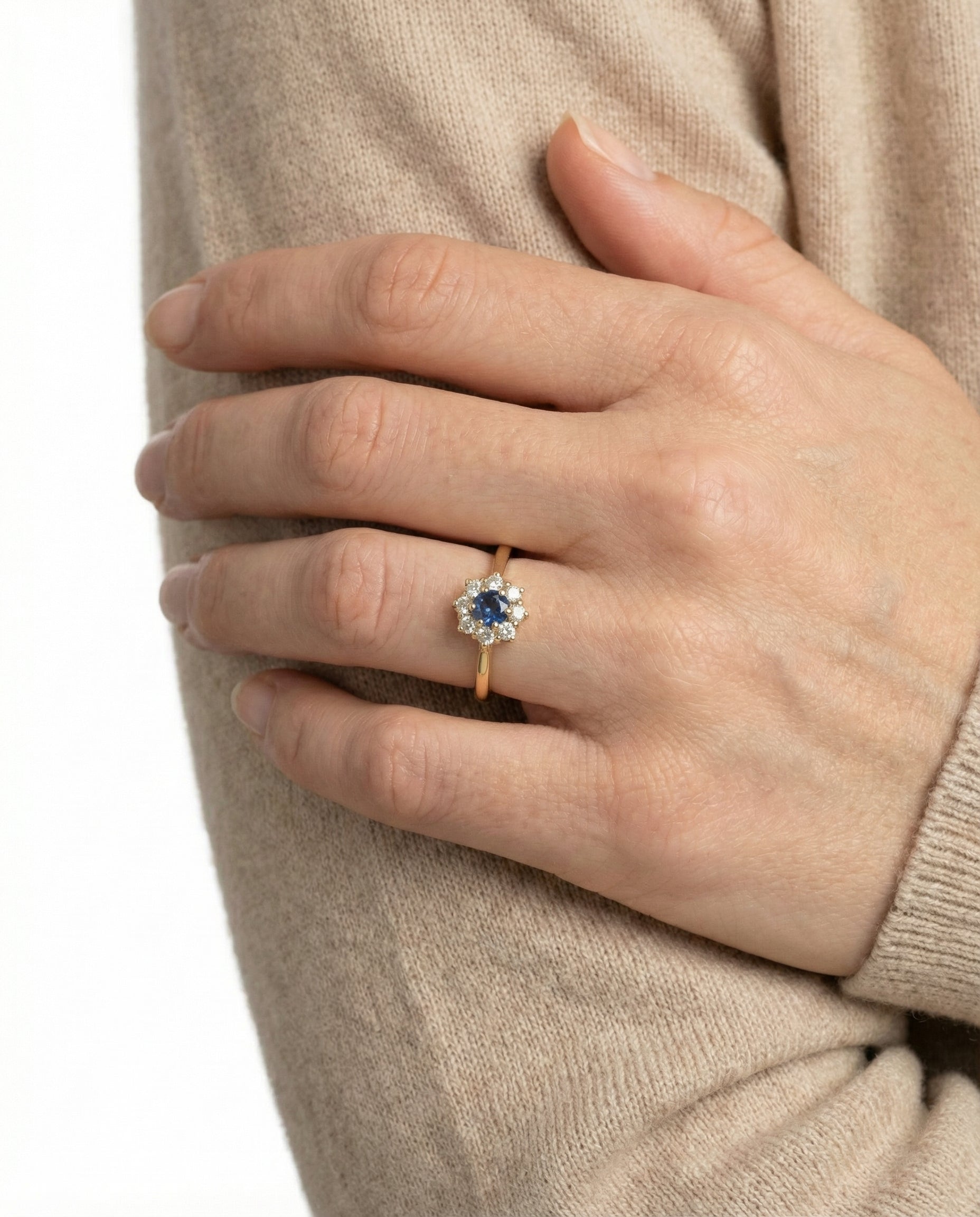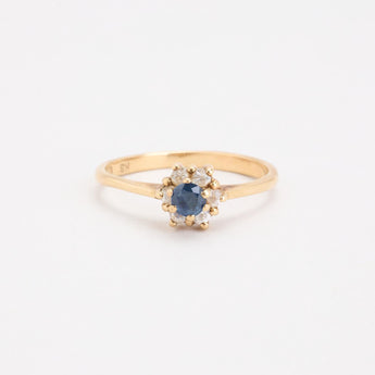 Rosetring i 8K guld med en safir og hvide sten, Str. 53