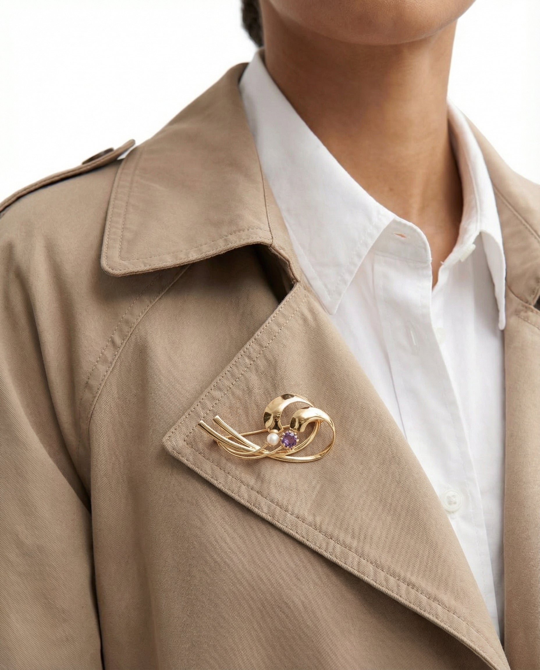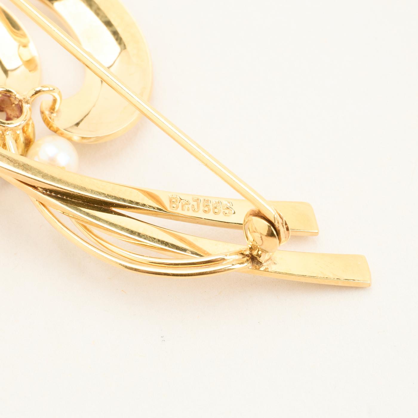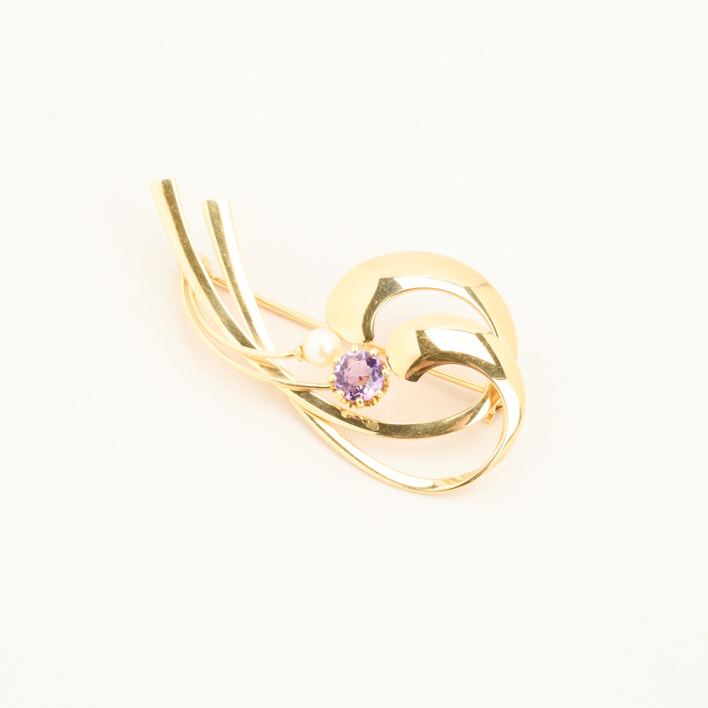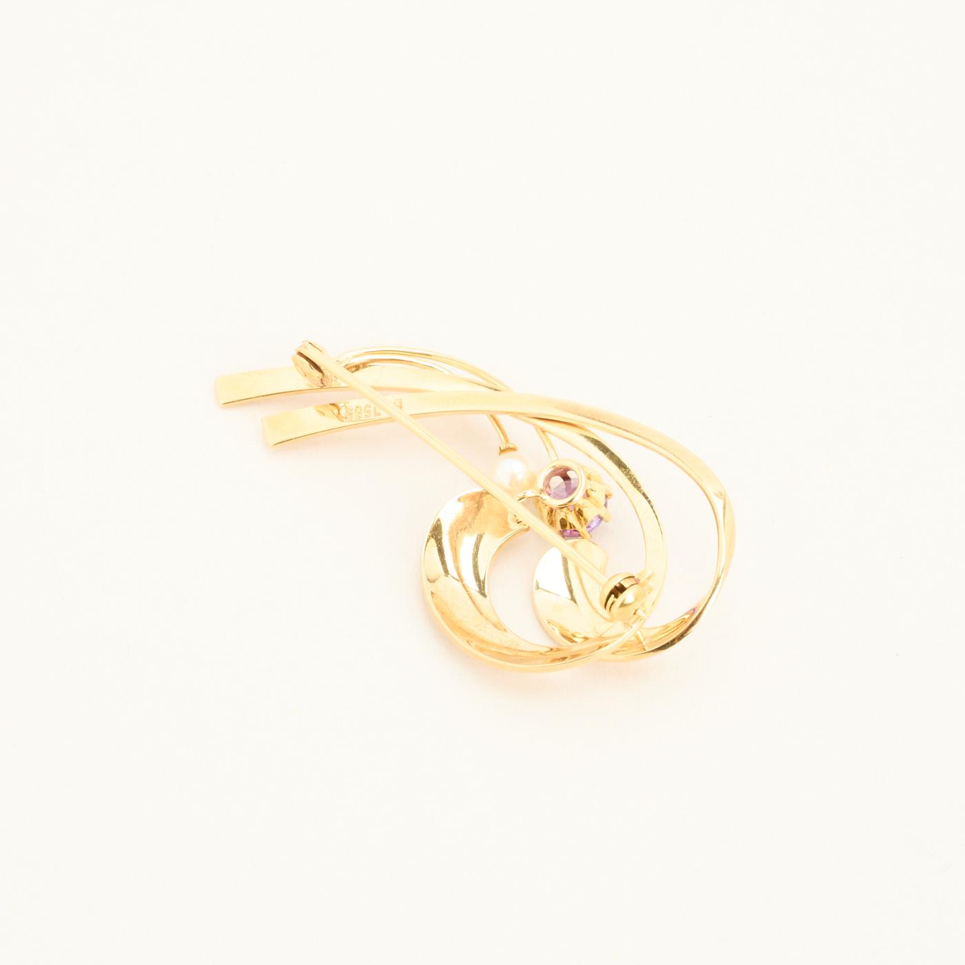 Broche i 14K guld med en perle og en lilla sten, 4.8 cm, 7.2 g