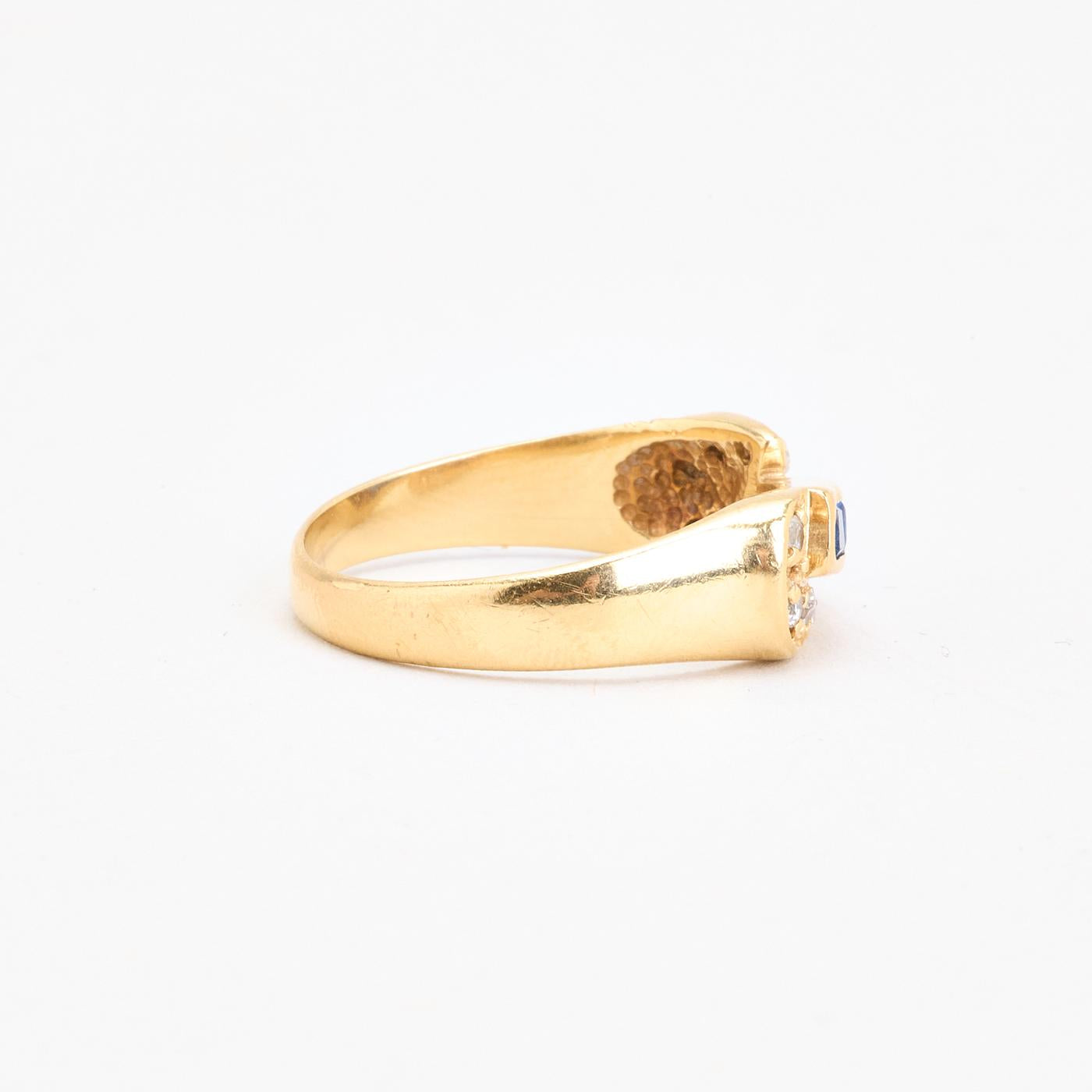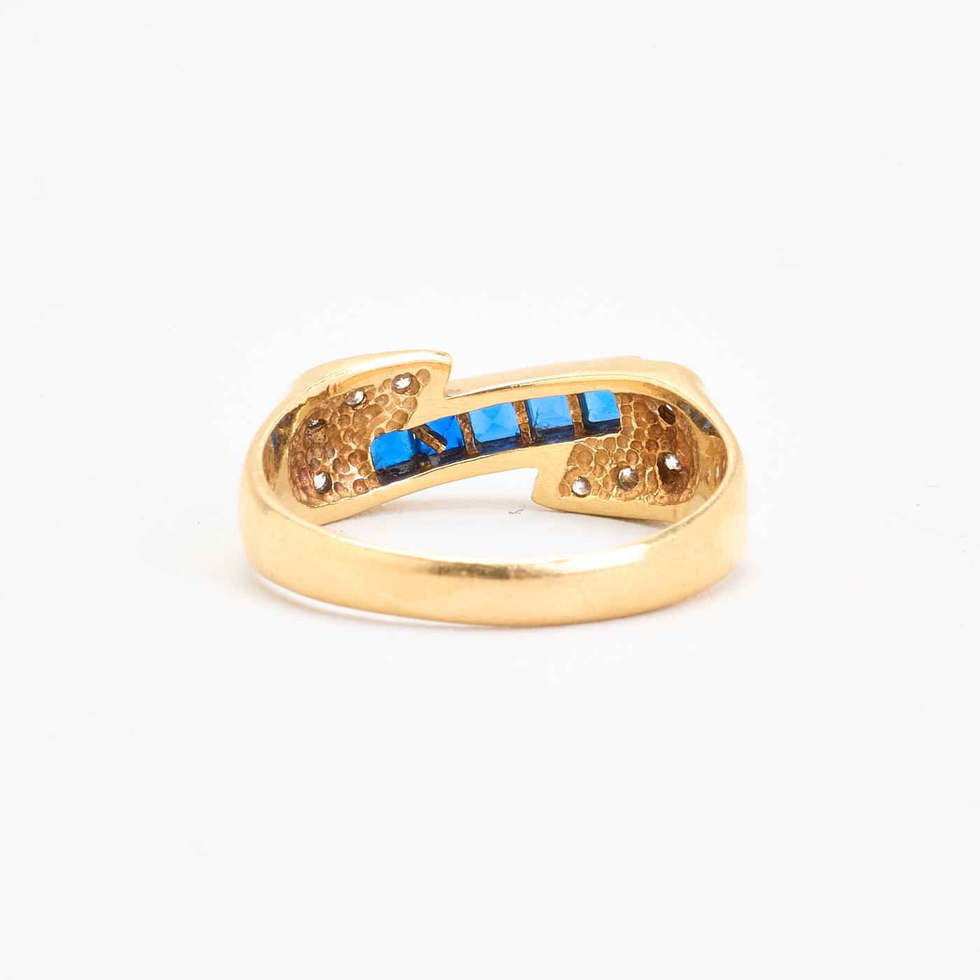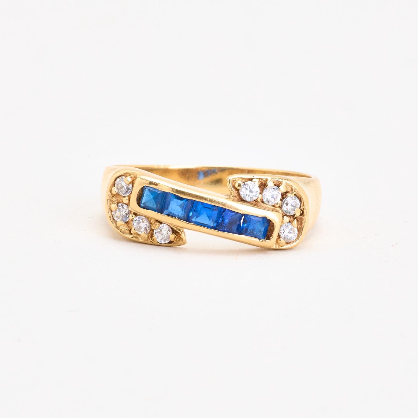 Crossoverring i 14K guld med hvide og blå sten, Str. 56