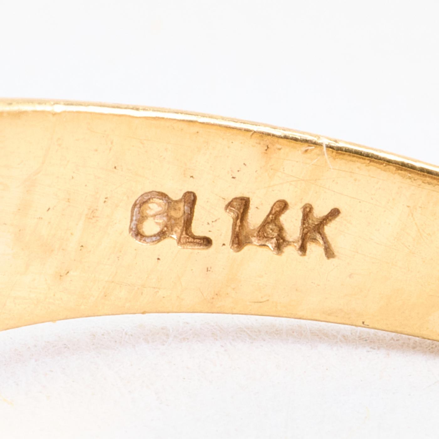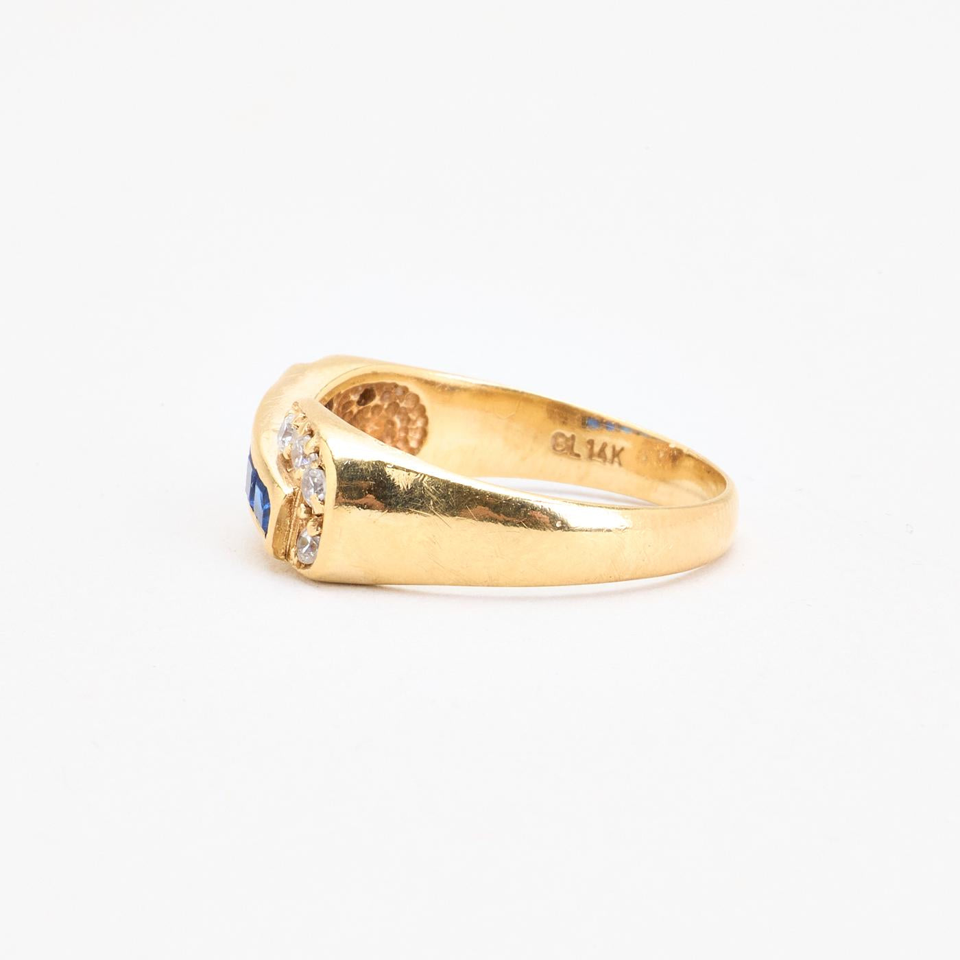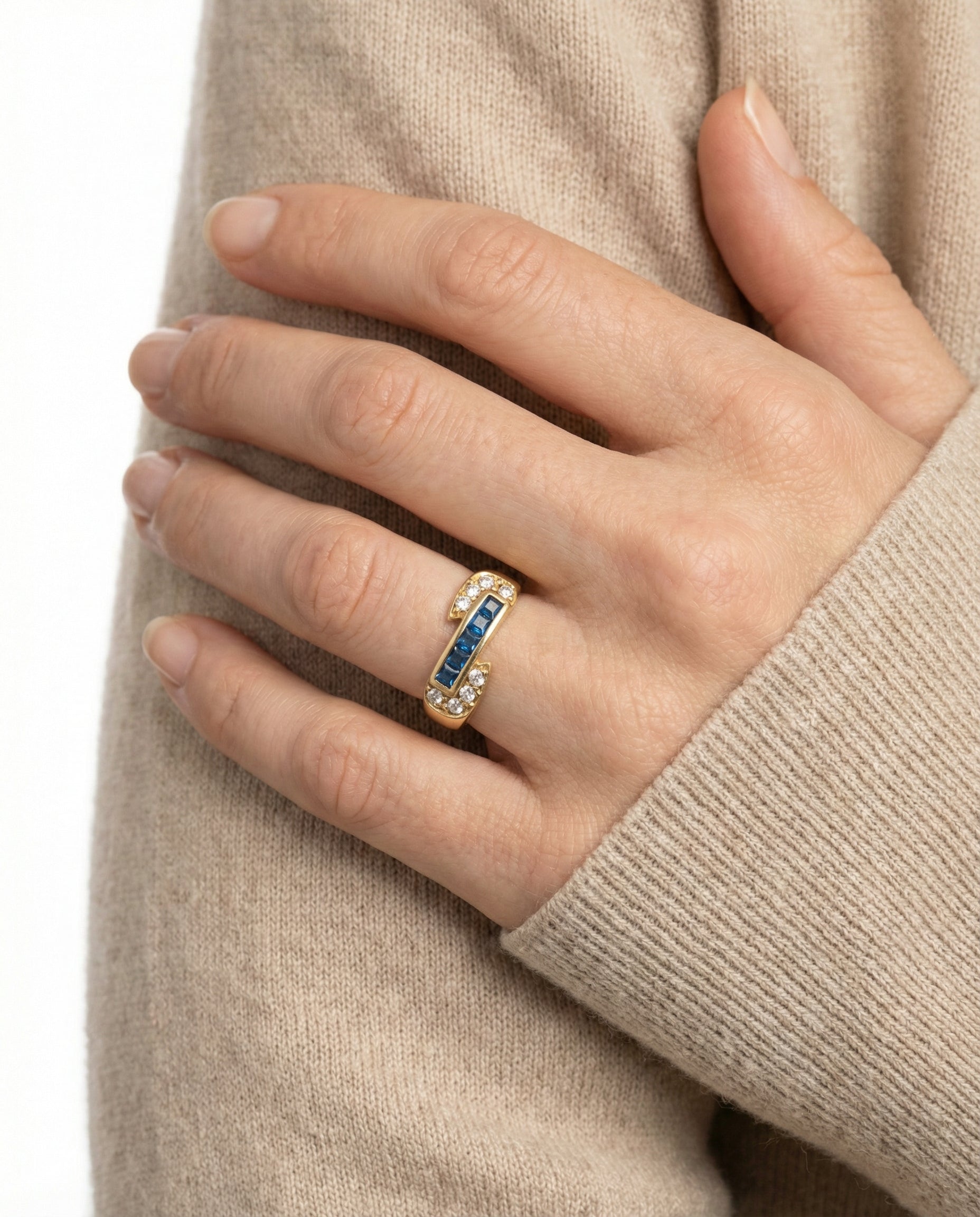 Crossoverring i 14K guld med hvide og blå sten, Str. 56