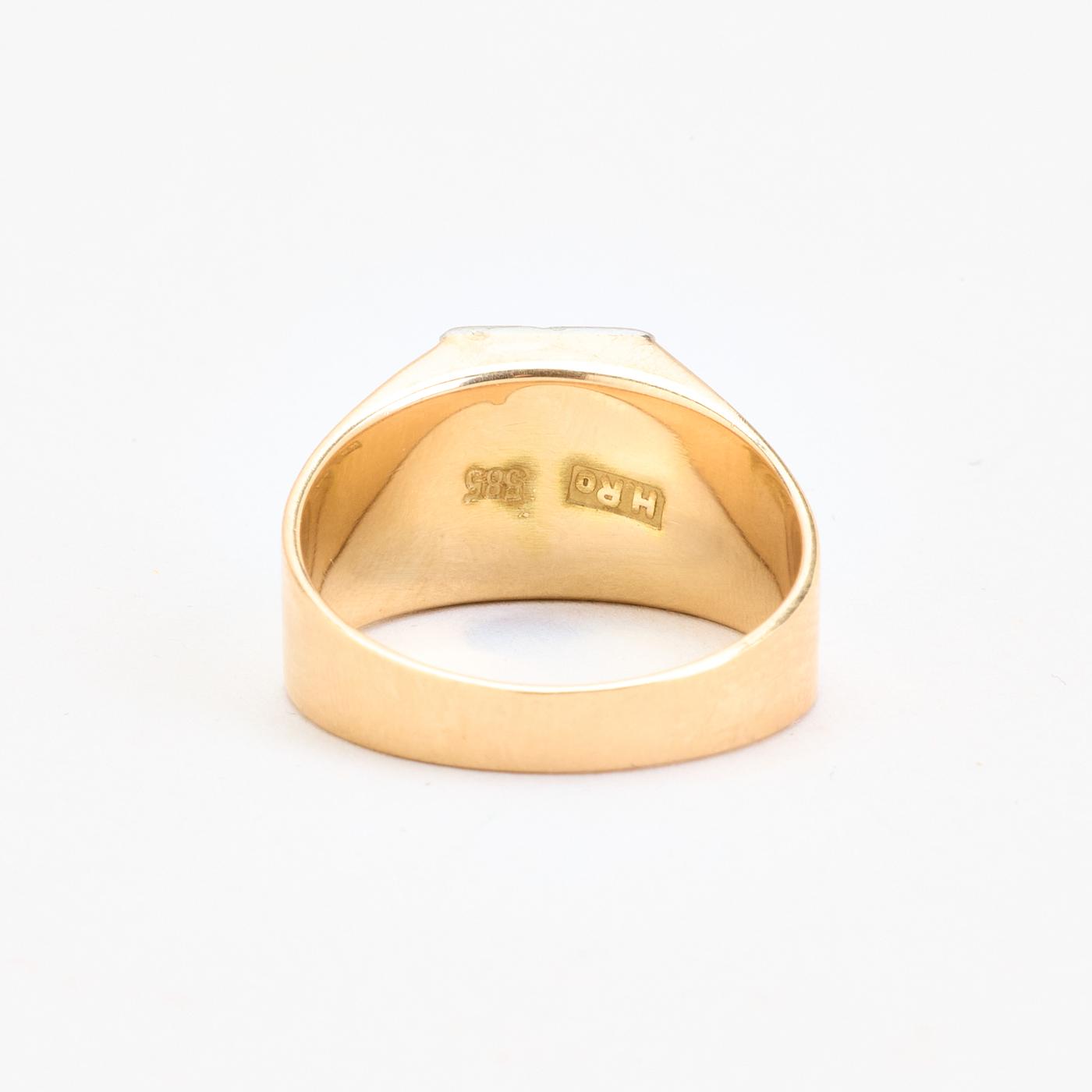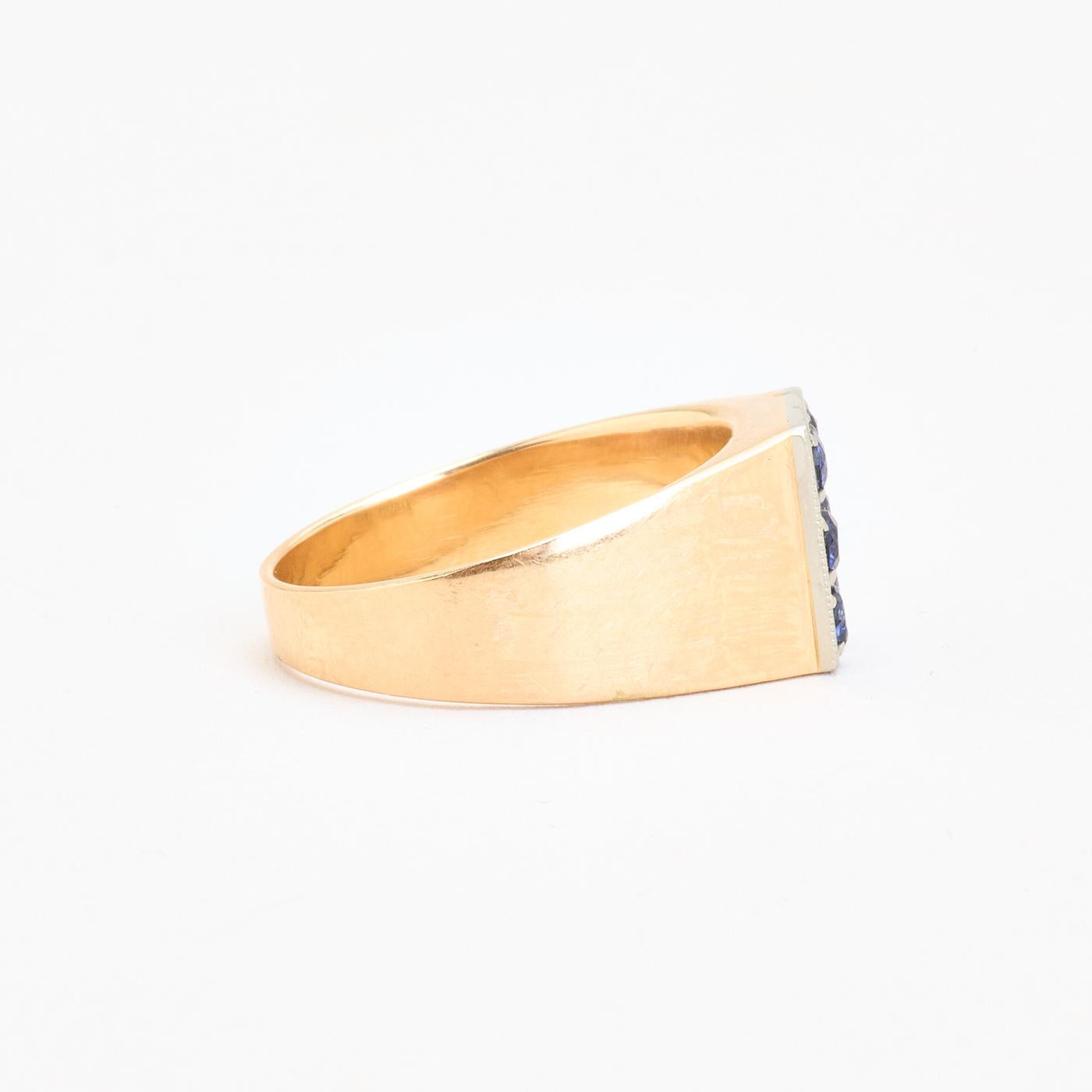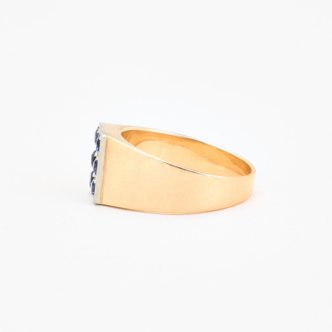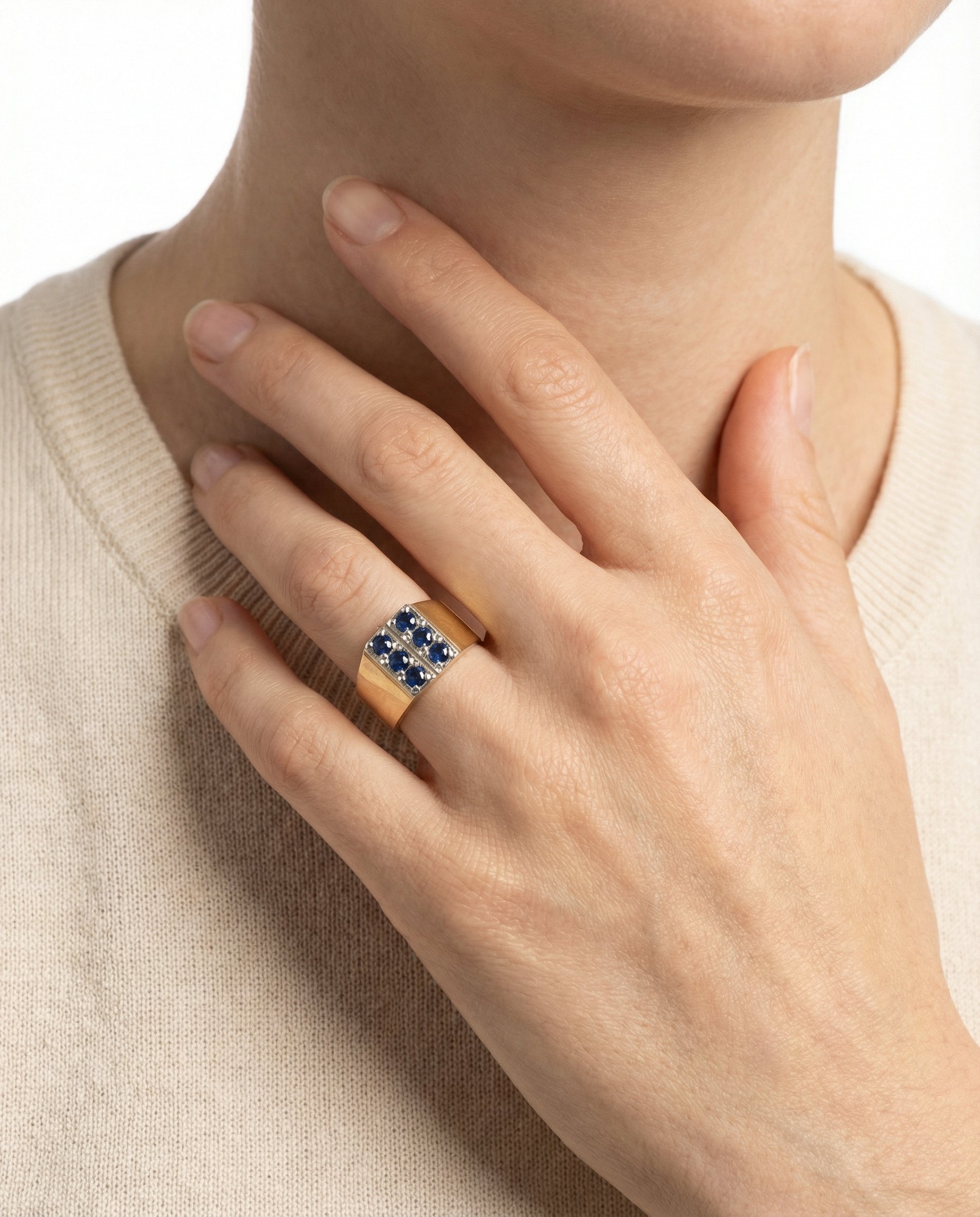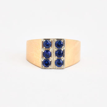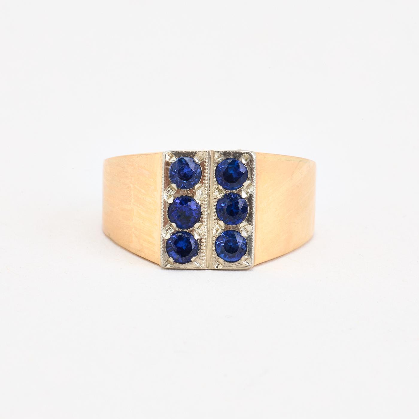 Signetring i 14K guld og hvidguld med flere blå sten, Str. 55