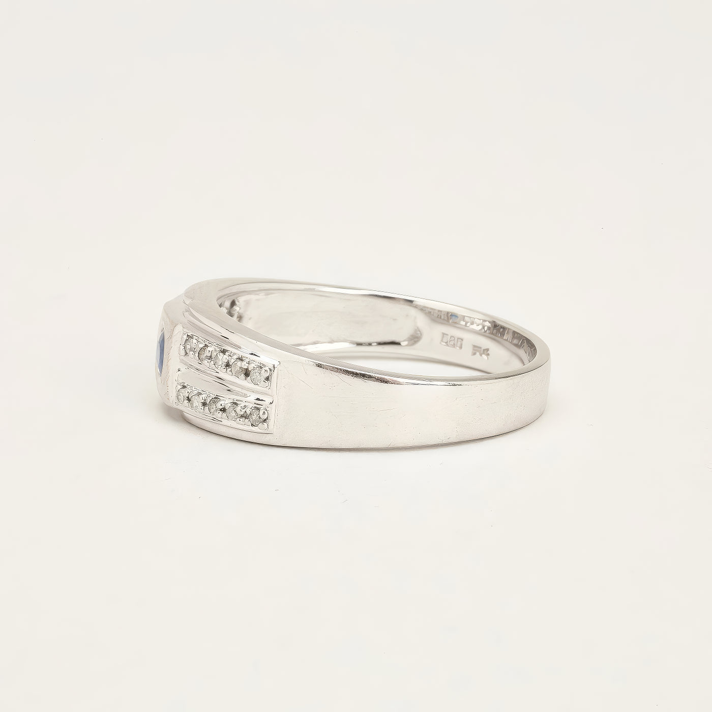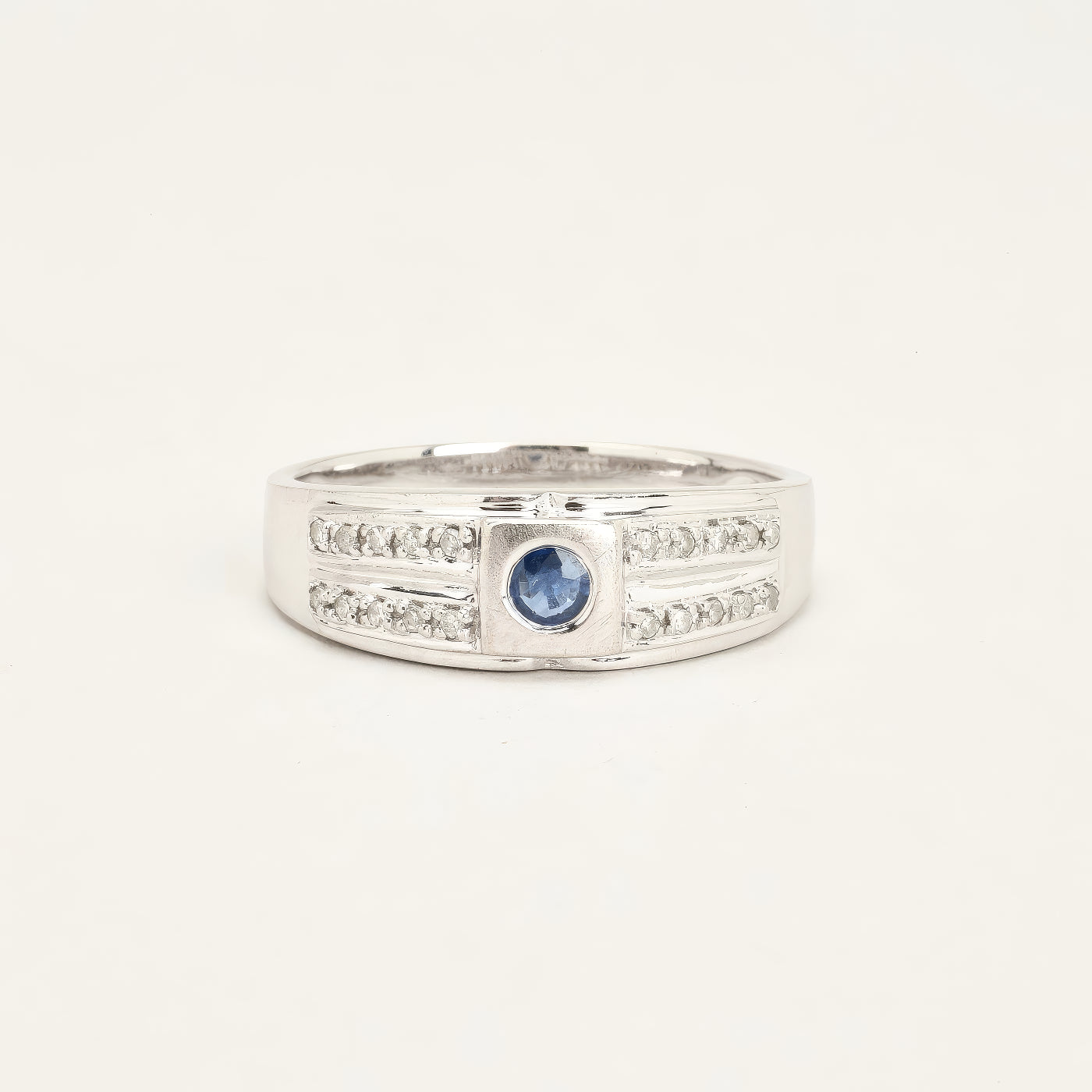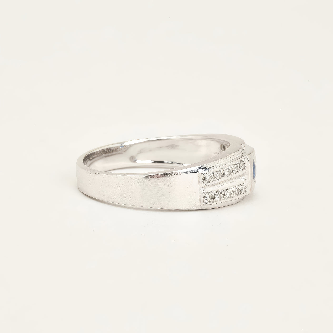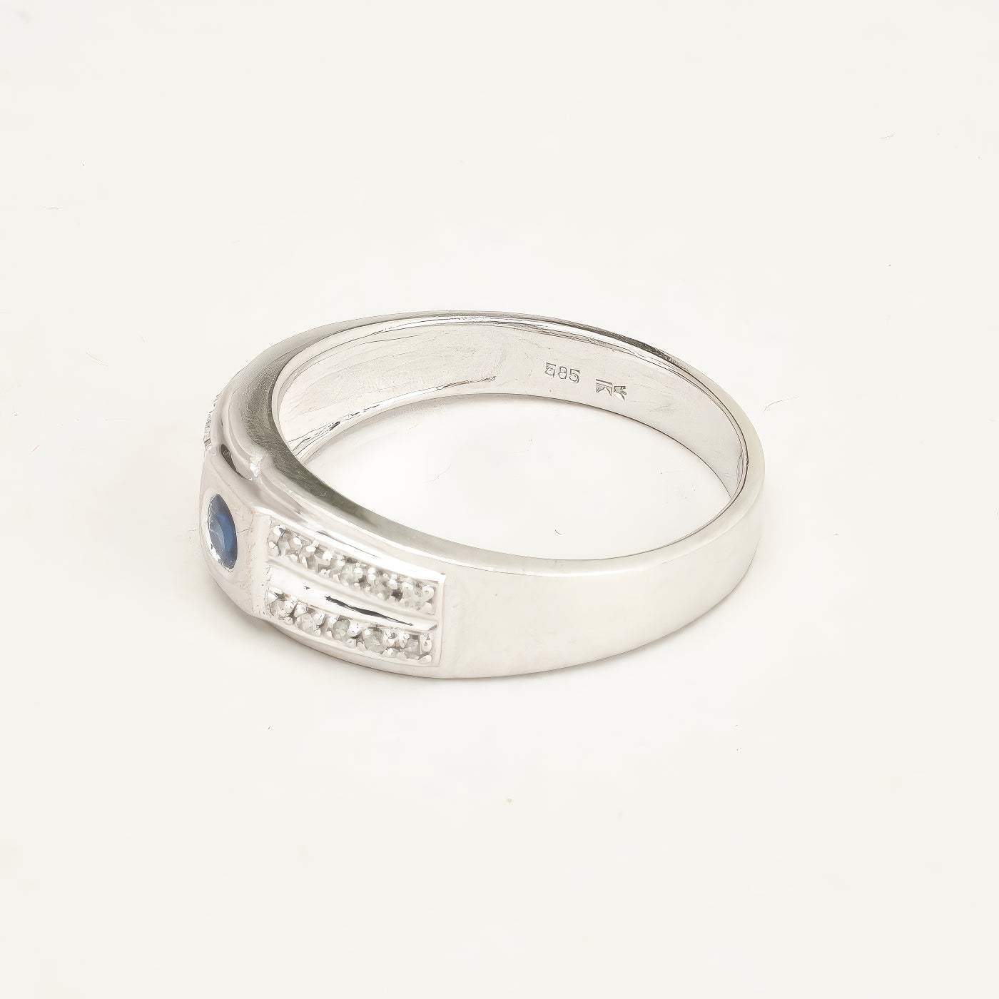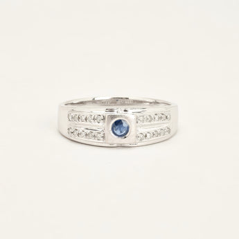 Gypsyring i 14K hvidguld med flere diamanter (0.16 ct) og en safir, Str. 69