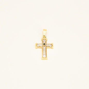 Kors vedhæng i 14K guld og hvidguld med flere hvide sten og en blå sten, 3,5 cm, 5,37 g