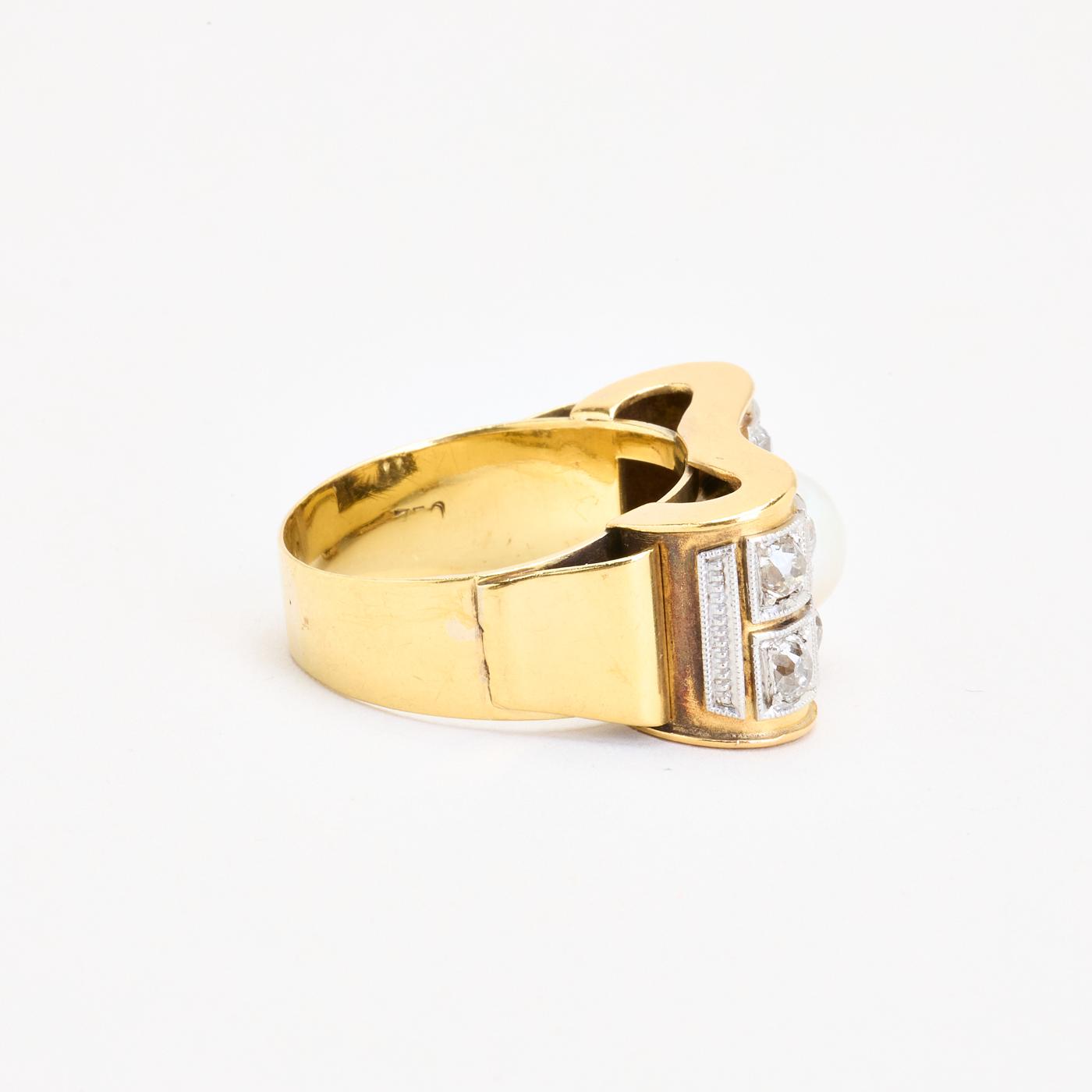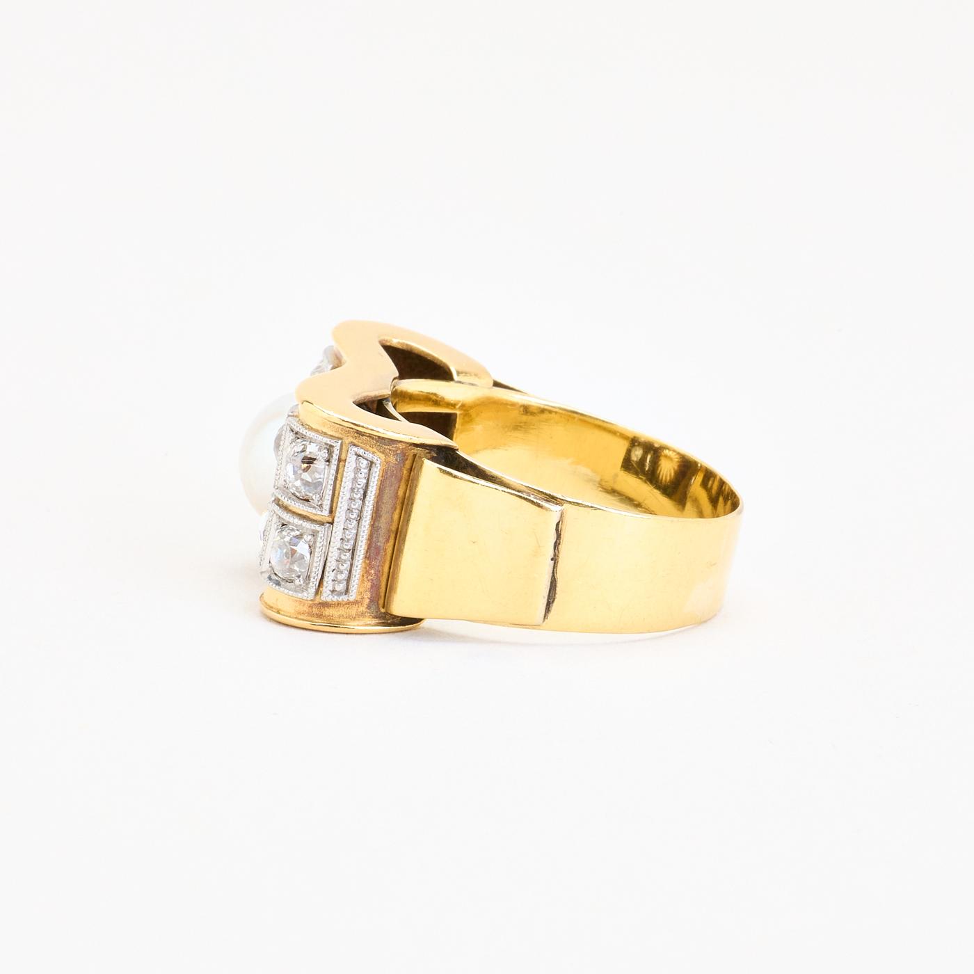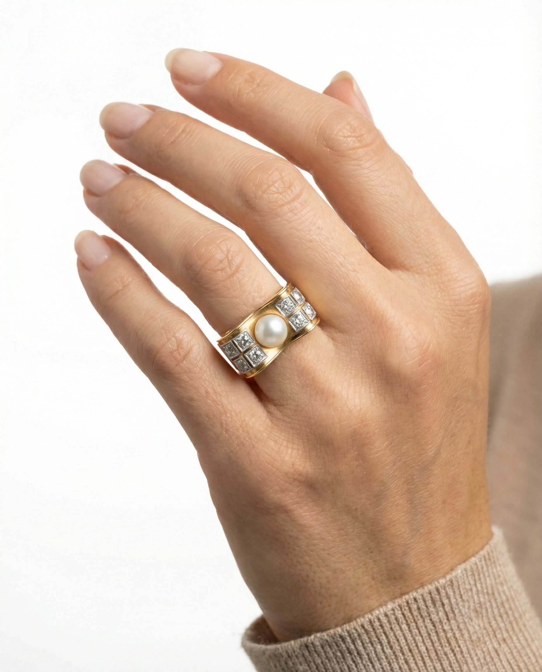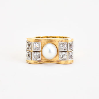 Statement ring i 18K guld og hvidguld med diamanter (1.07 ct) og en perle, Str. 61