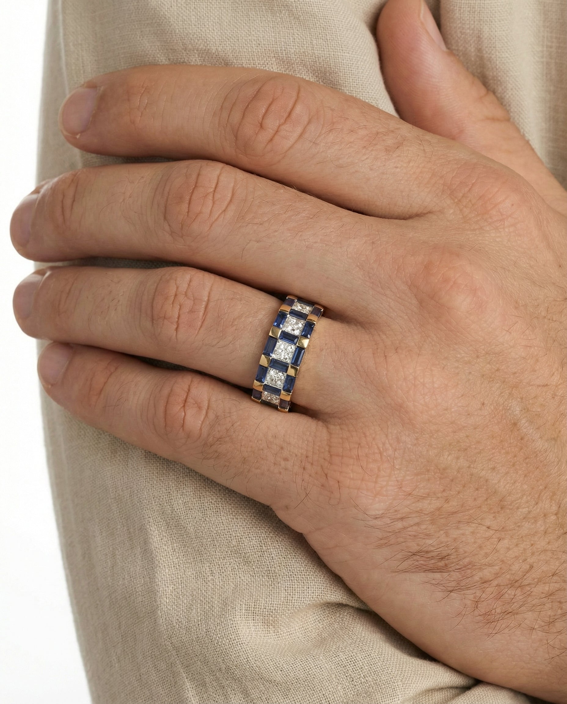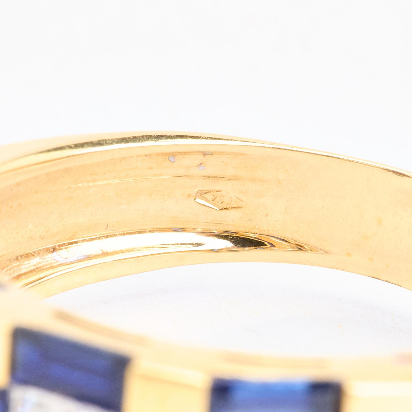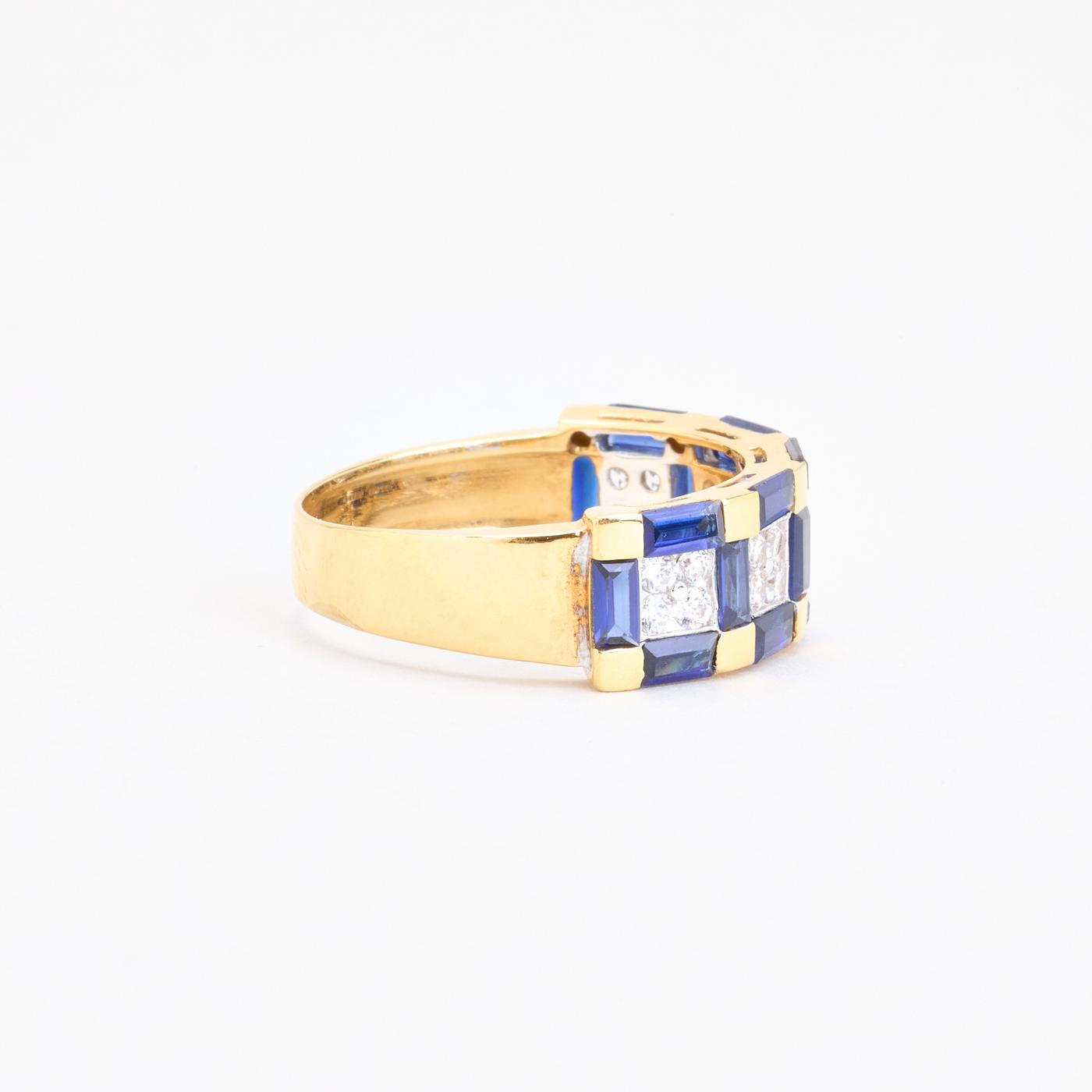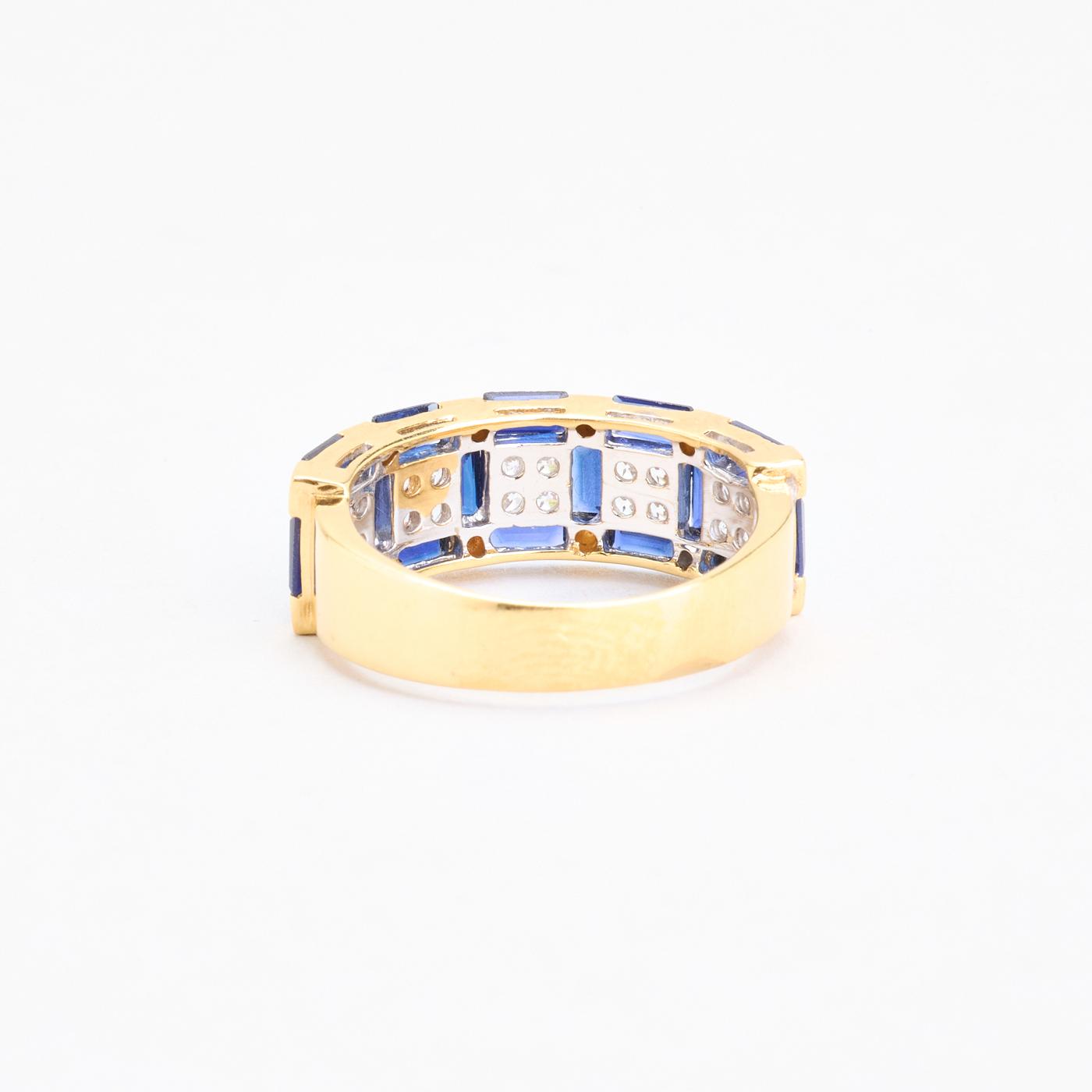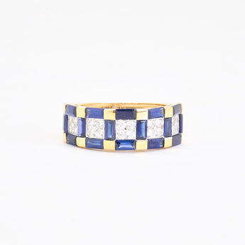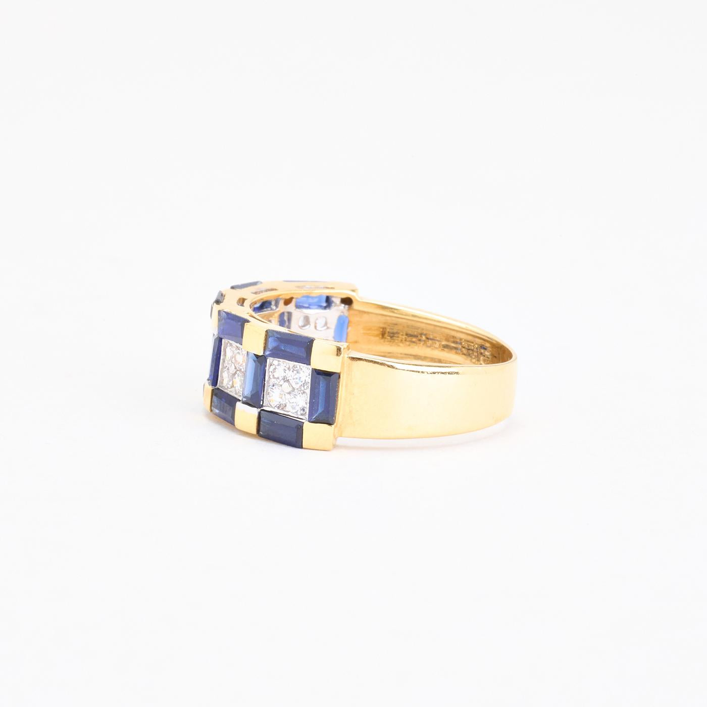 Geometrisk ring i 18K guld med flere safirer og hvide sten, Str. 57