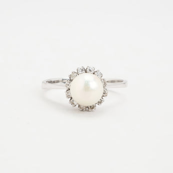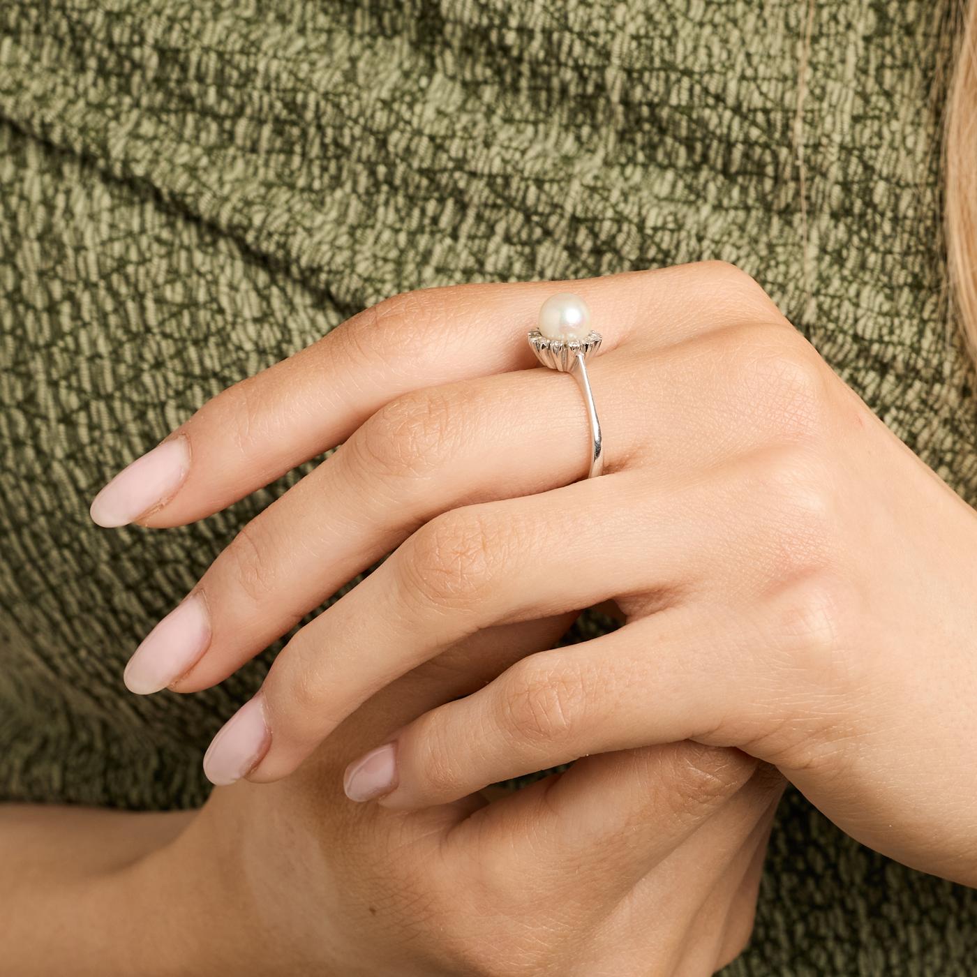 Rosetring i 14K hvidguld med perle og diamanter (0.13 ct), Str. 57