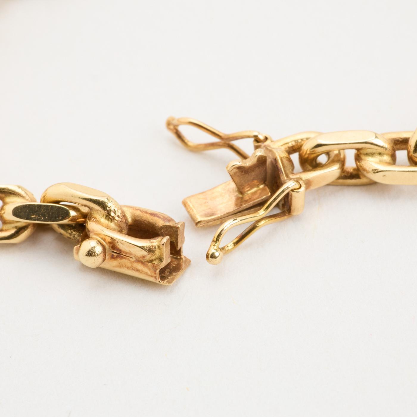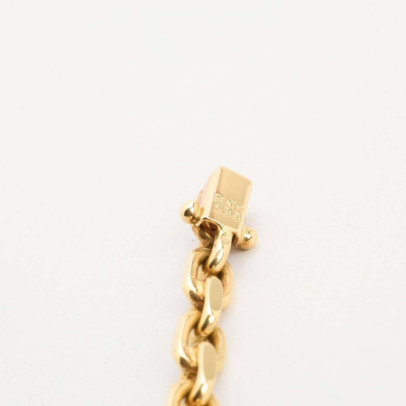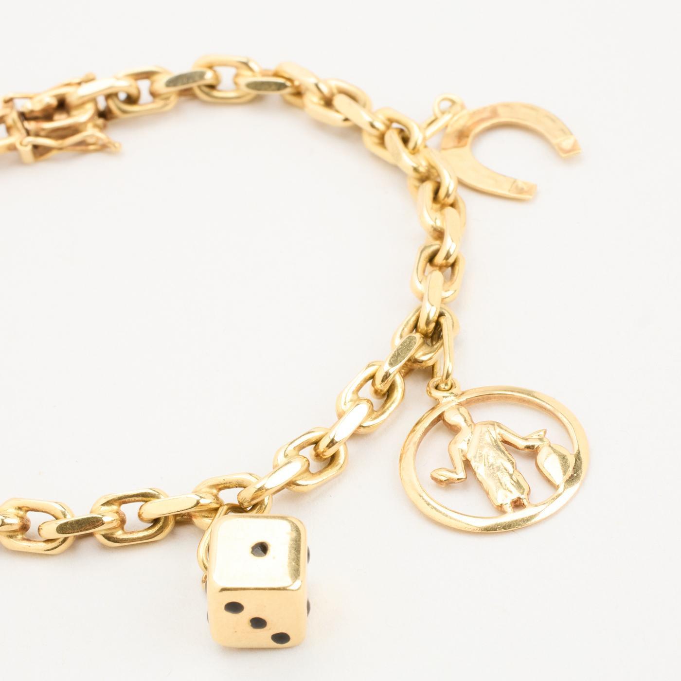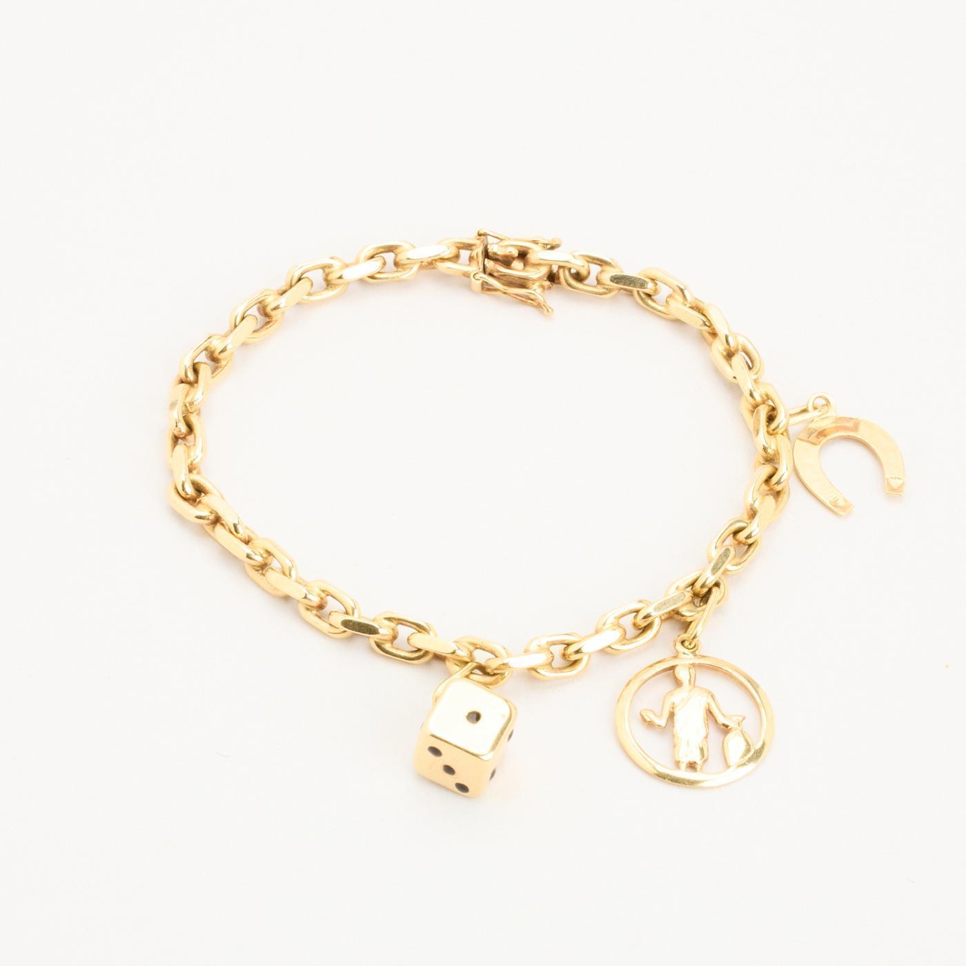 Ankerkæde charmarmbånd i 14K guld med terning med sorte emaljeprikker, minimalistisk hestesko og medaljon med kvindefigur, 19 cm, kasselås
