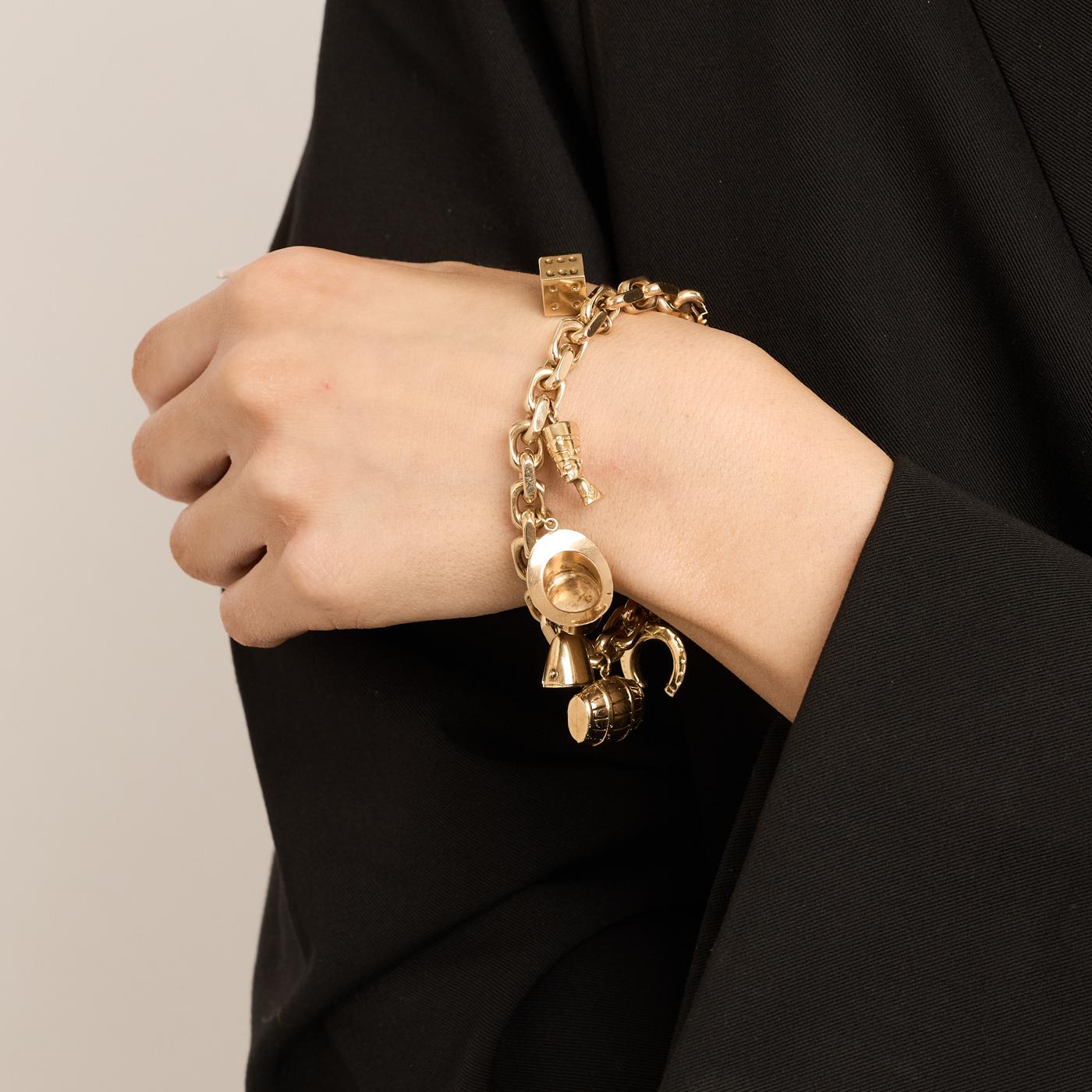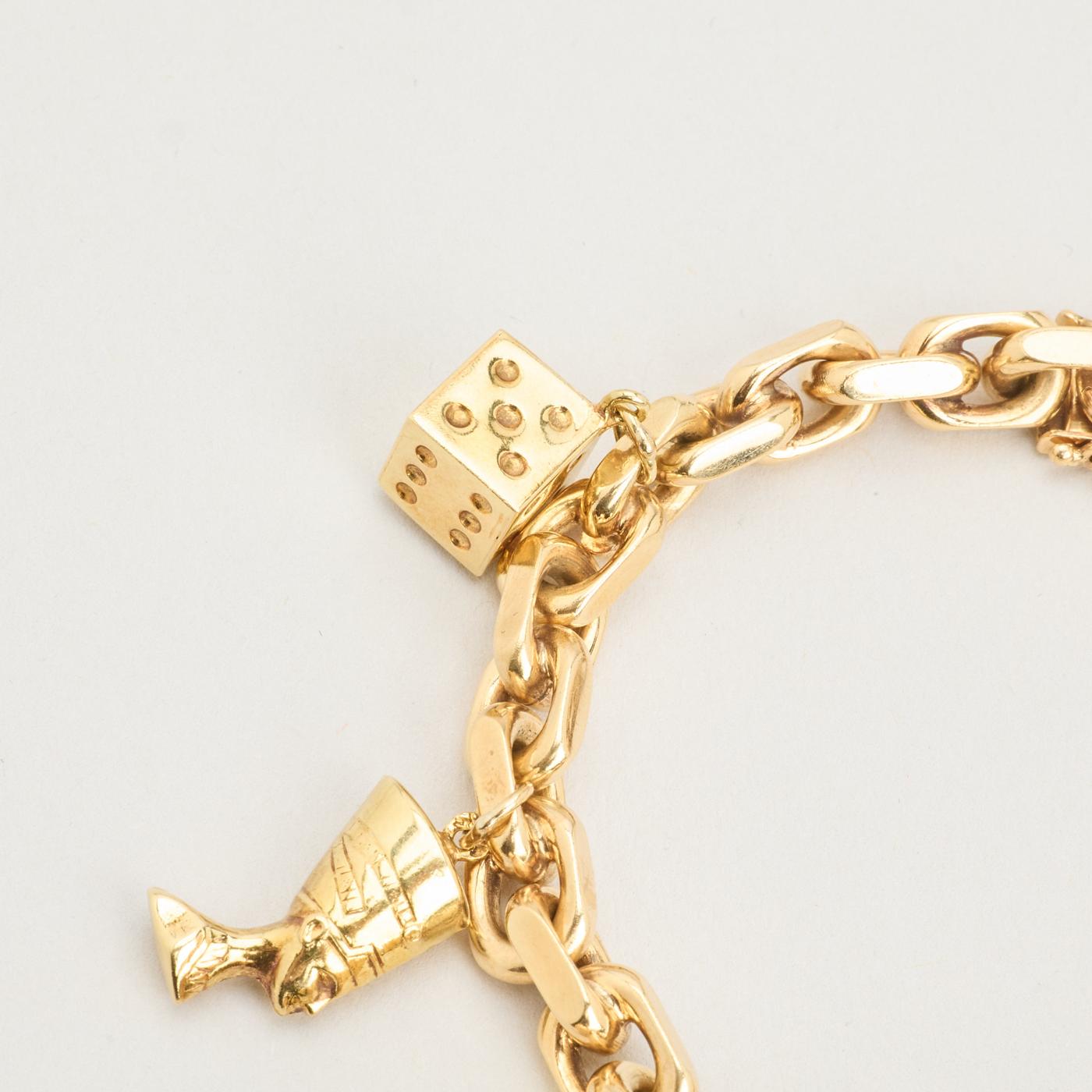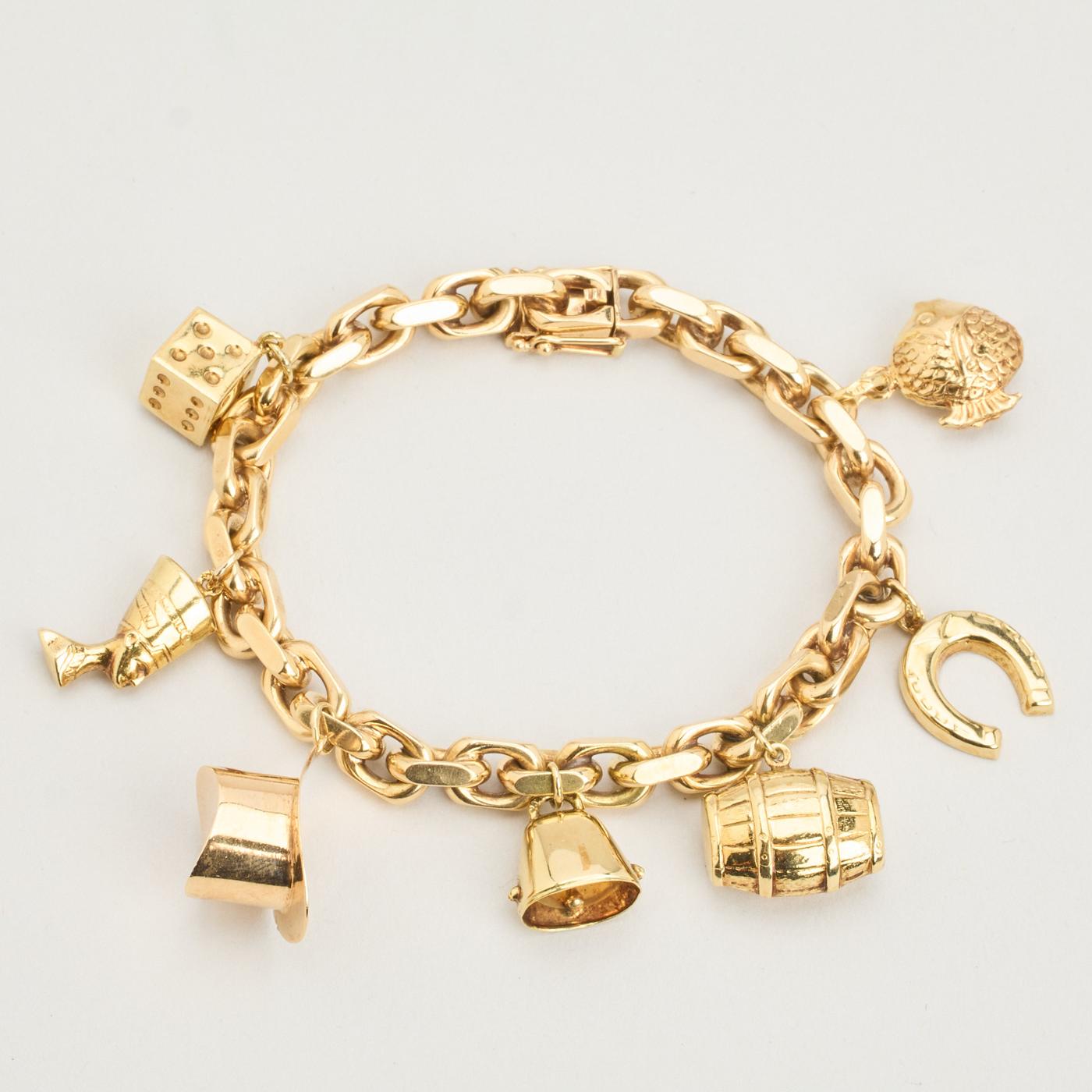 Model: Ankerkæde charm armbånd i 14K guld med syv lykke-symboler, 19 cm, kasselås