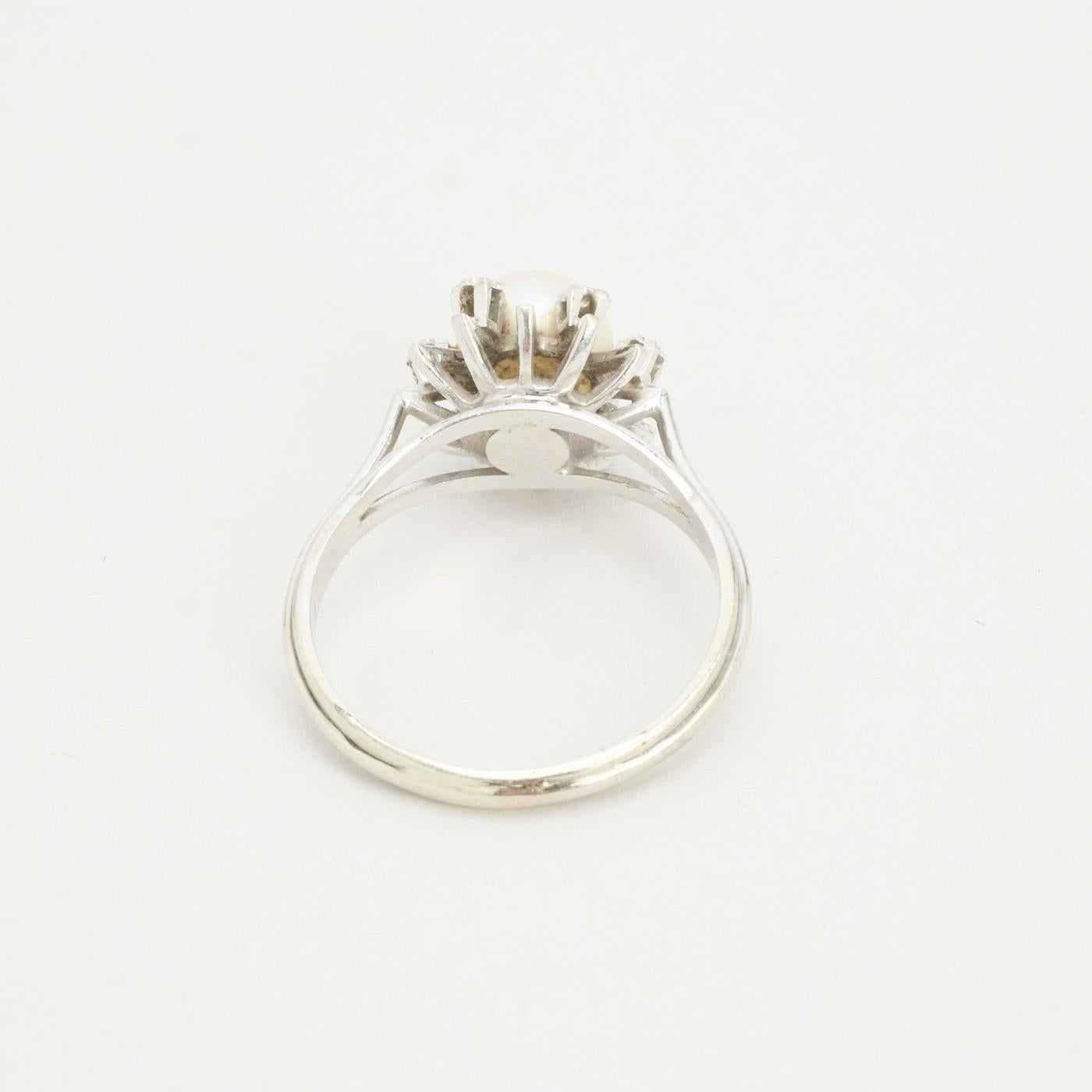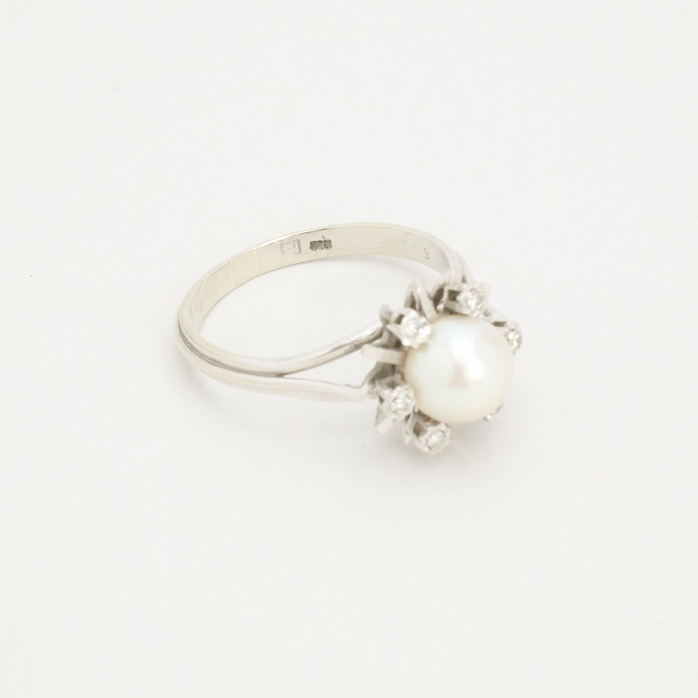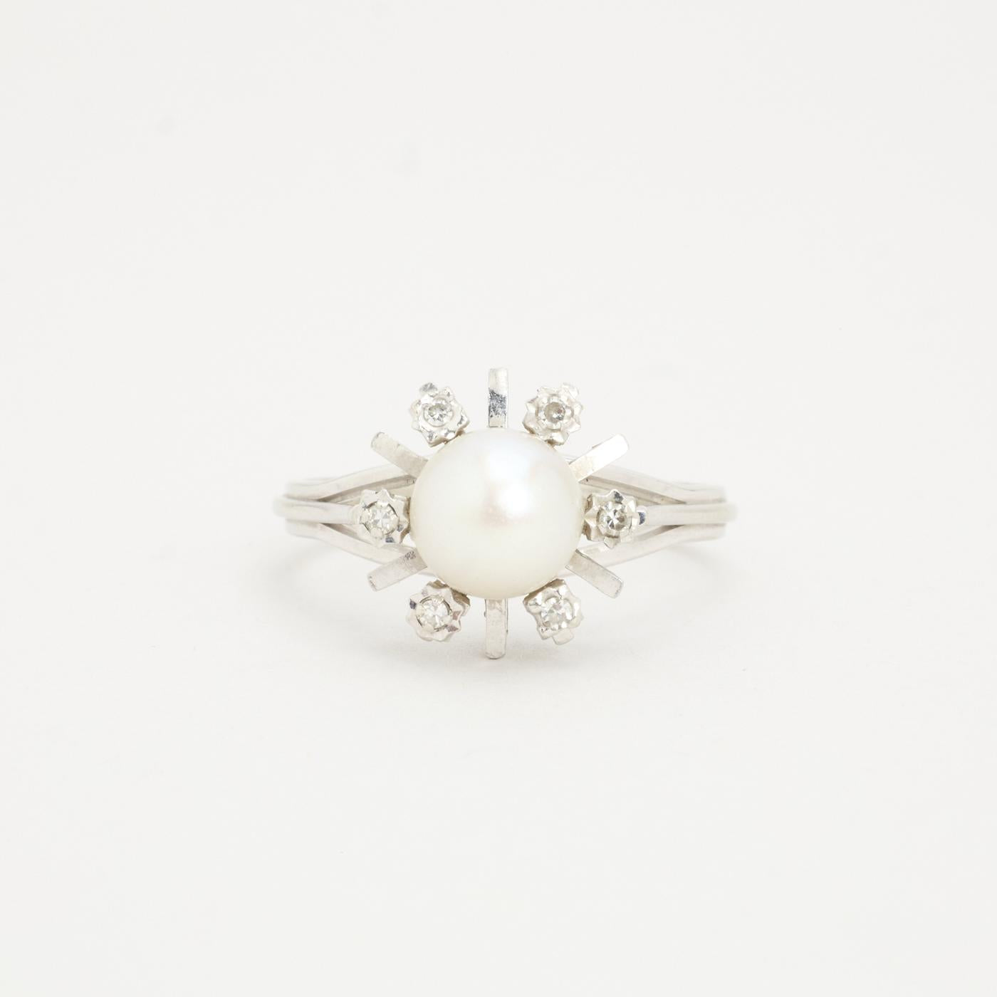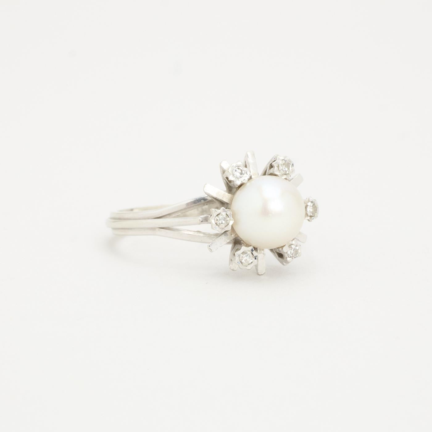 Statement ring i 14K hvidguld med perle og diamanter (0,03 ct), Str. 57