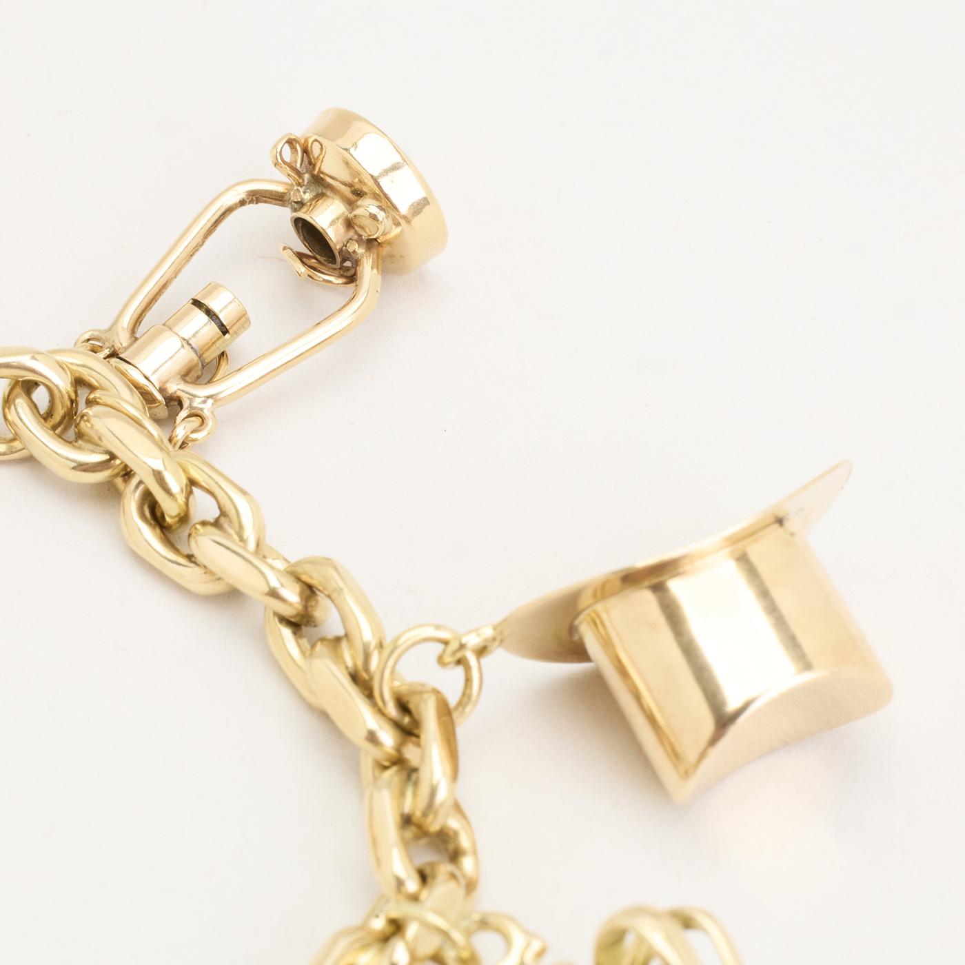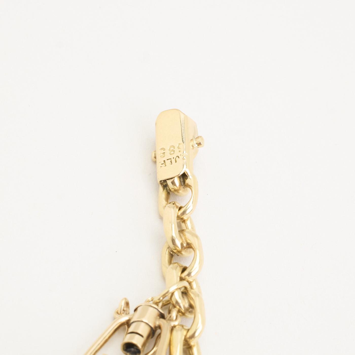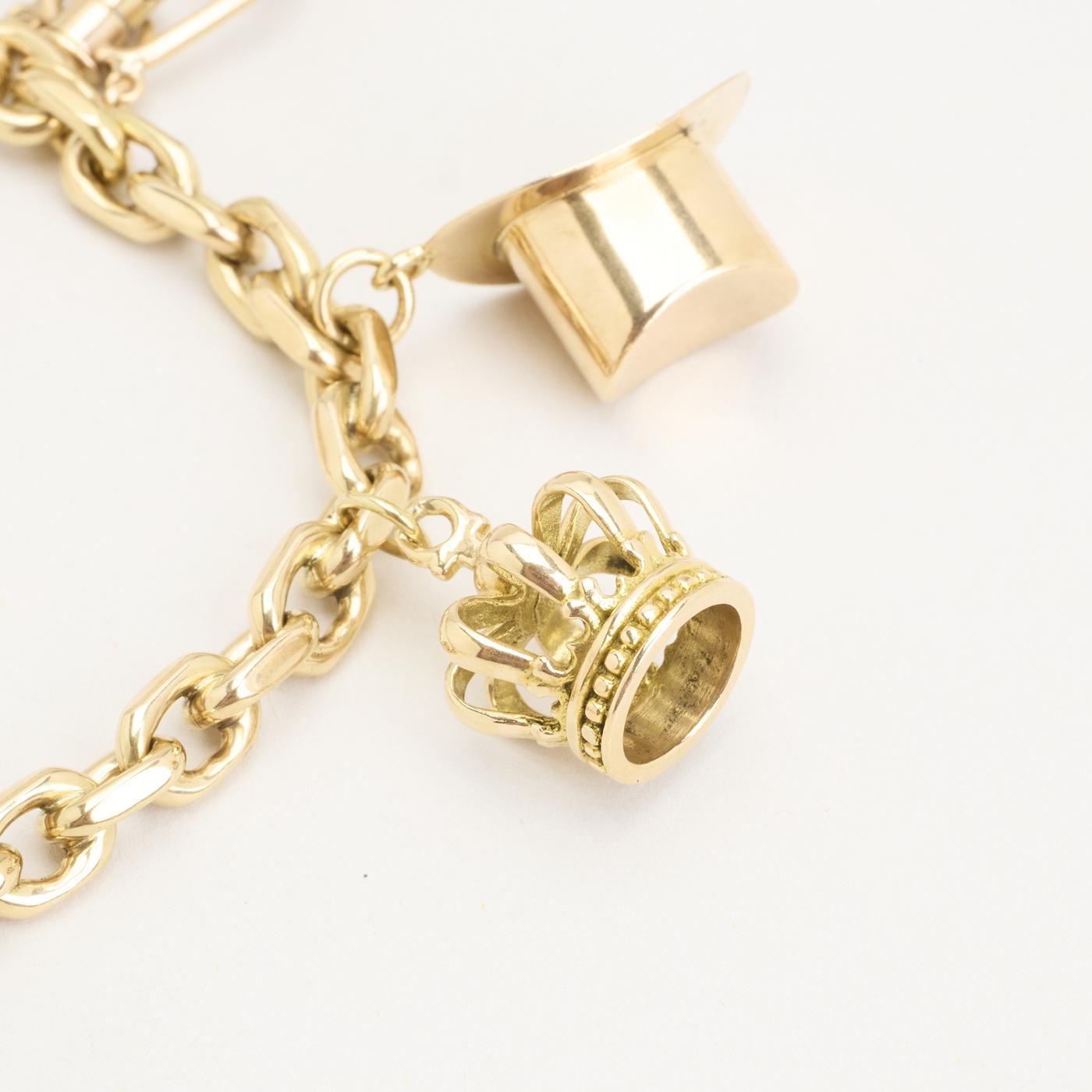 Model: Ankerkæde charmarmbånd i 14K guld med seks charms, 20 cm, kasselås