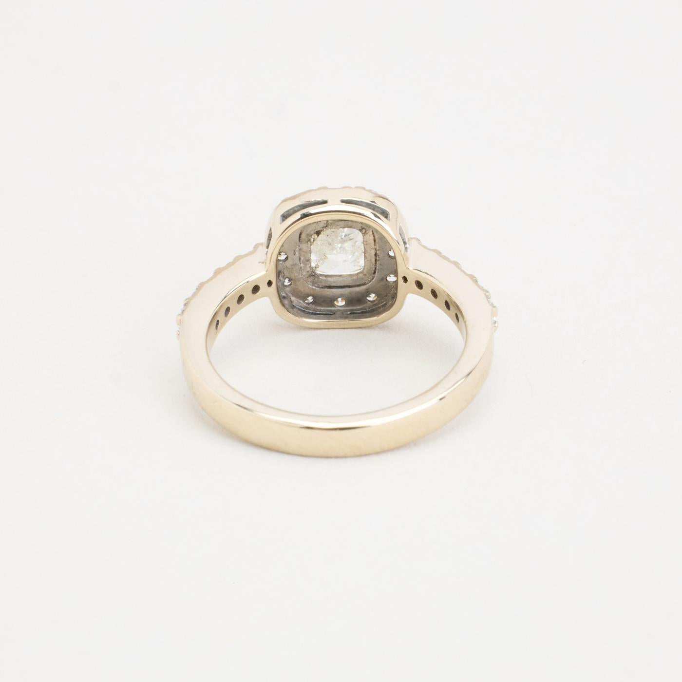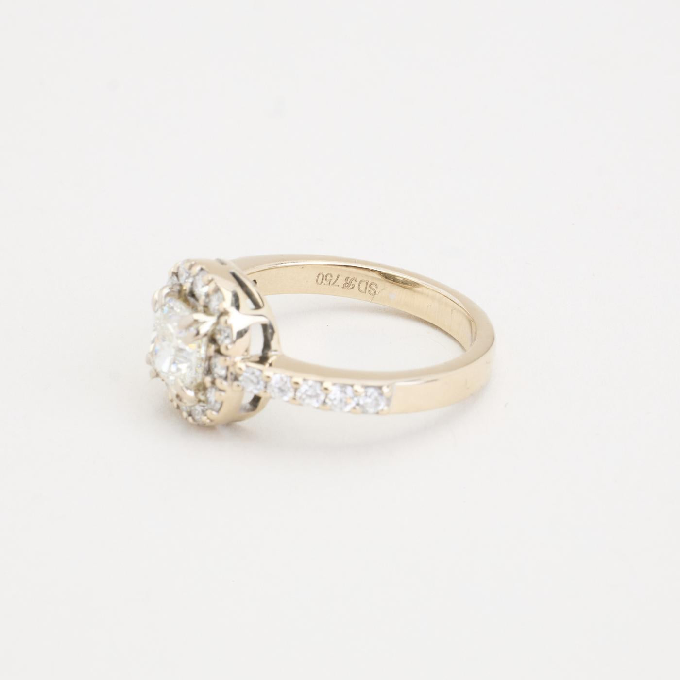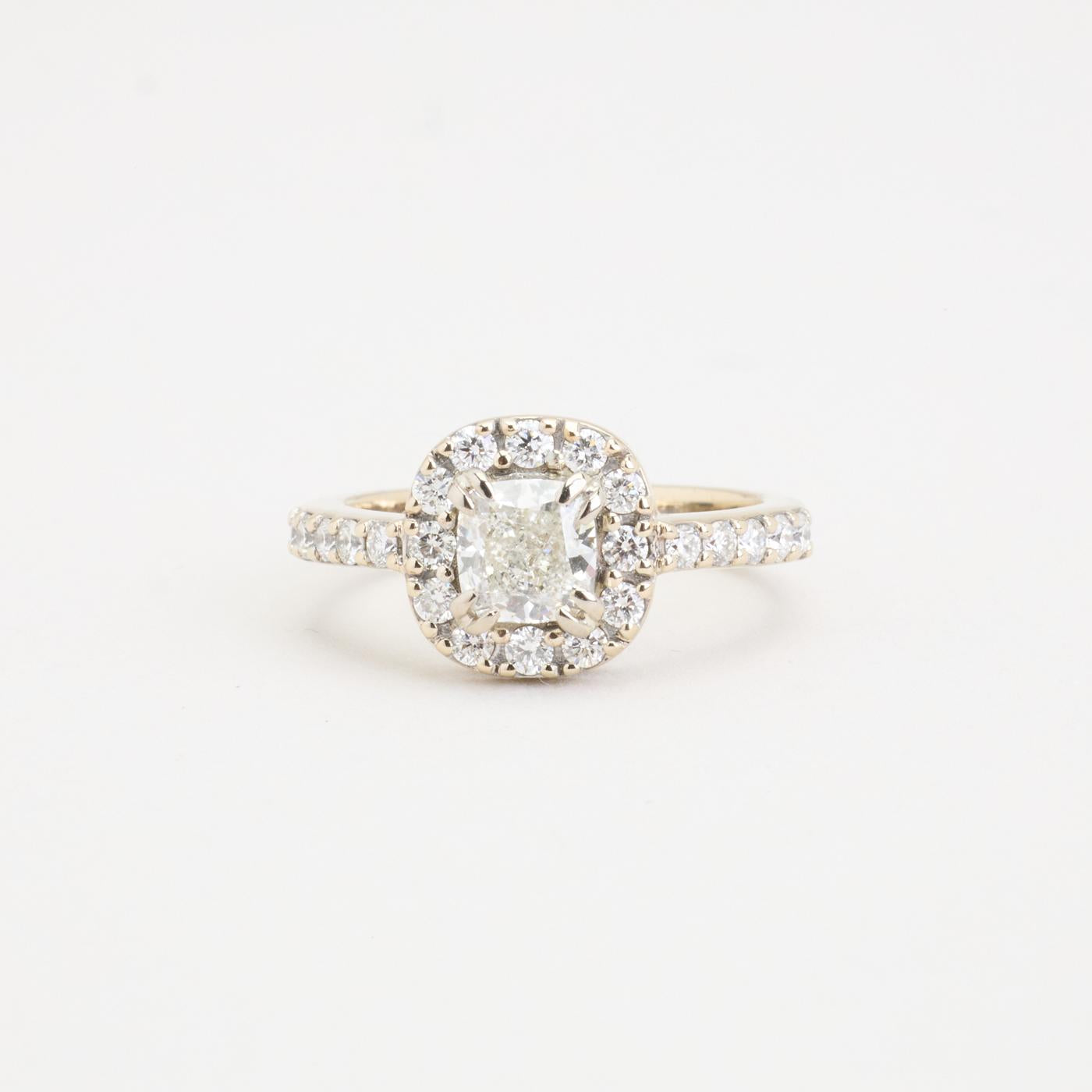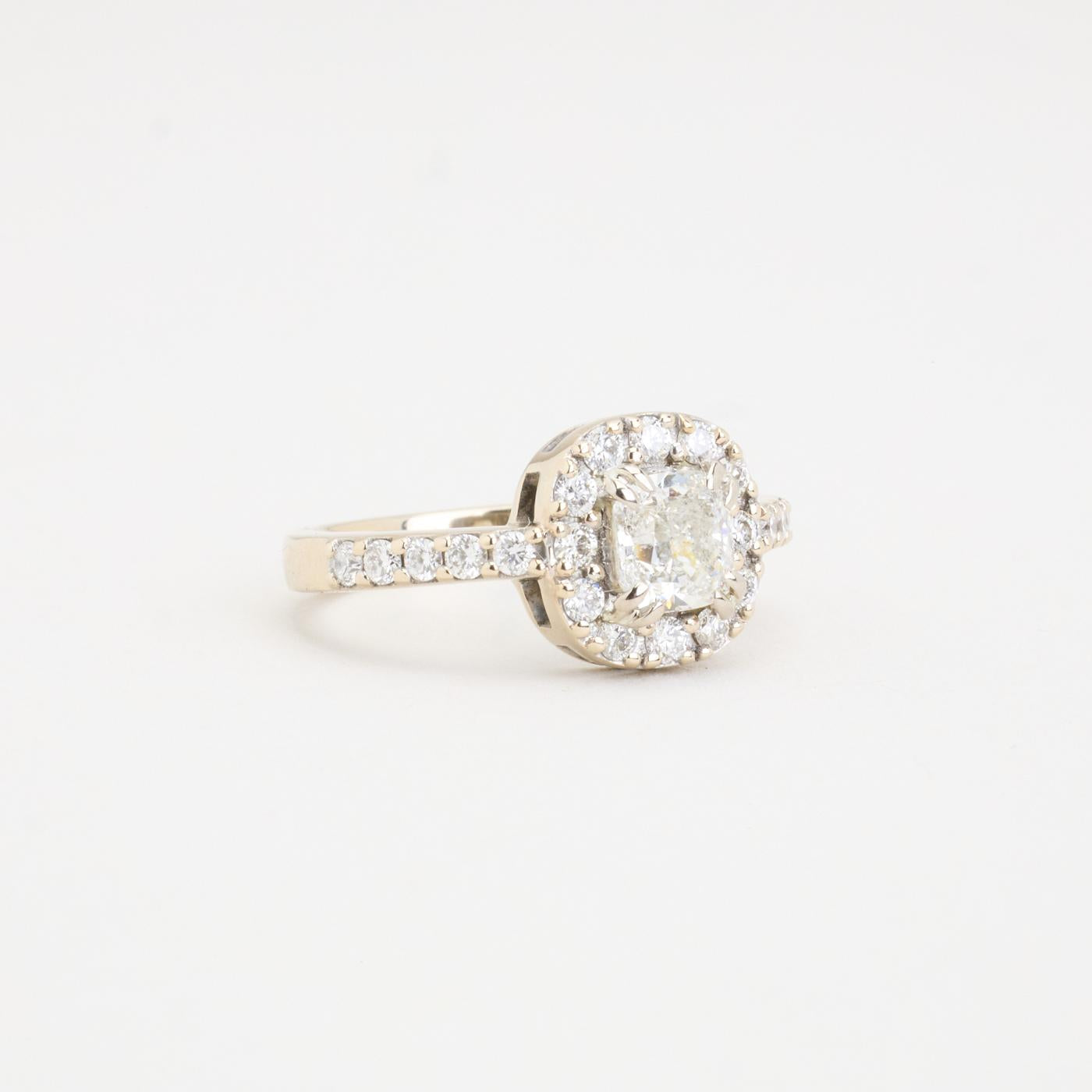 Halo ring i 18K hvidguld med en Cushion Modified Brilliant diamant (1.08 ct) og pavé-satte diamanter (0.38 ct), Str. 48