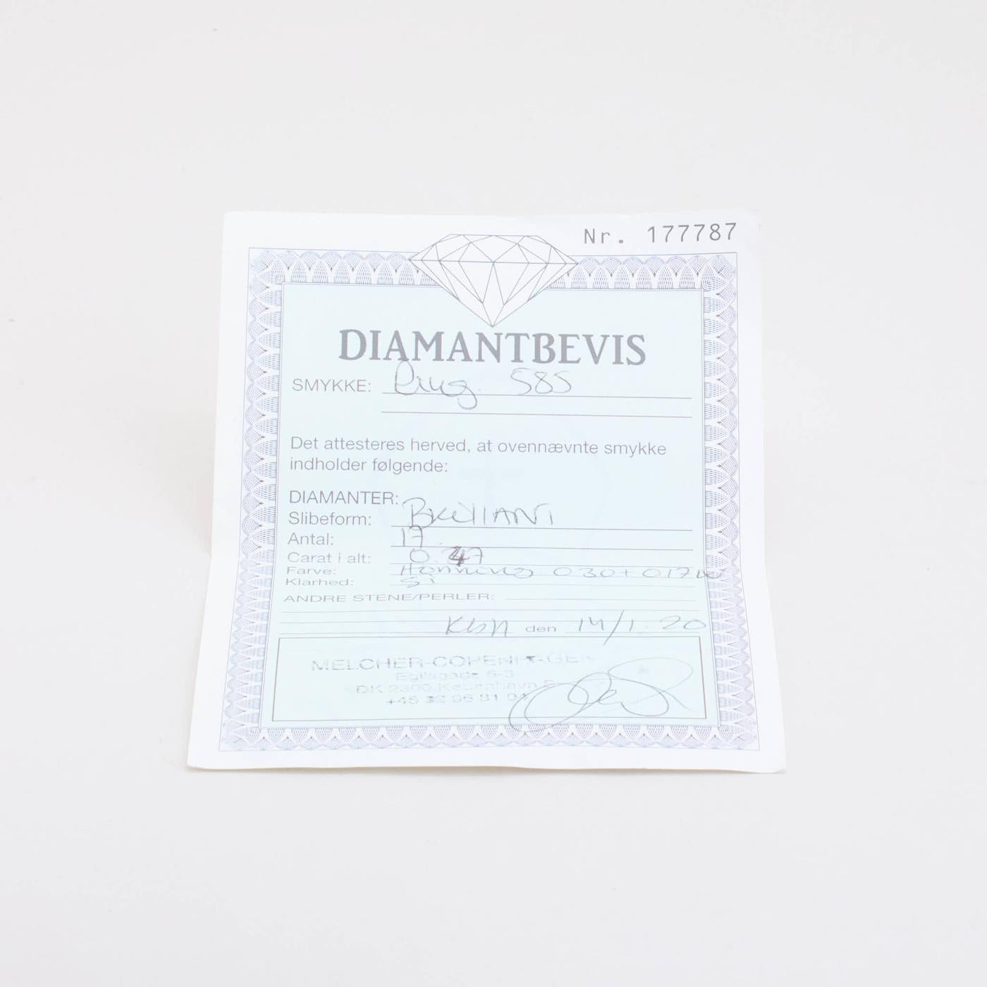 Diamanter: 0.64 ct. totalt fordelt på 17 naturlige diamanter. Centerstenen på 0.30 ct. brilliant-cut diamant (Farve Champagne, Klarhed SI) og 16 x 0.01 ct. Farve Wesselton. Klarhed SI og Øvrige sten på i alt 0.17 ct.