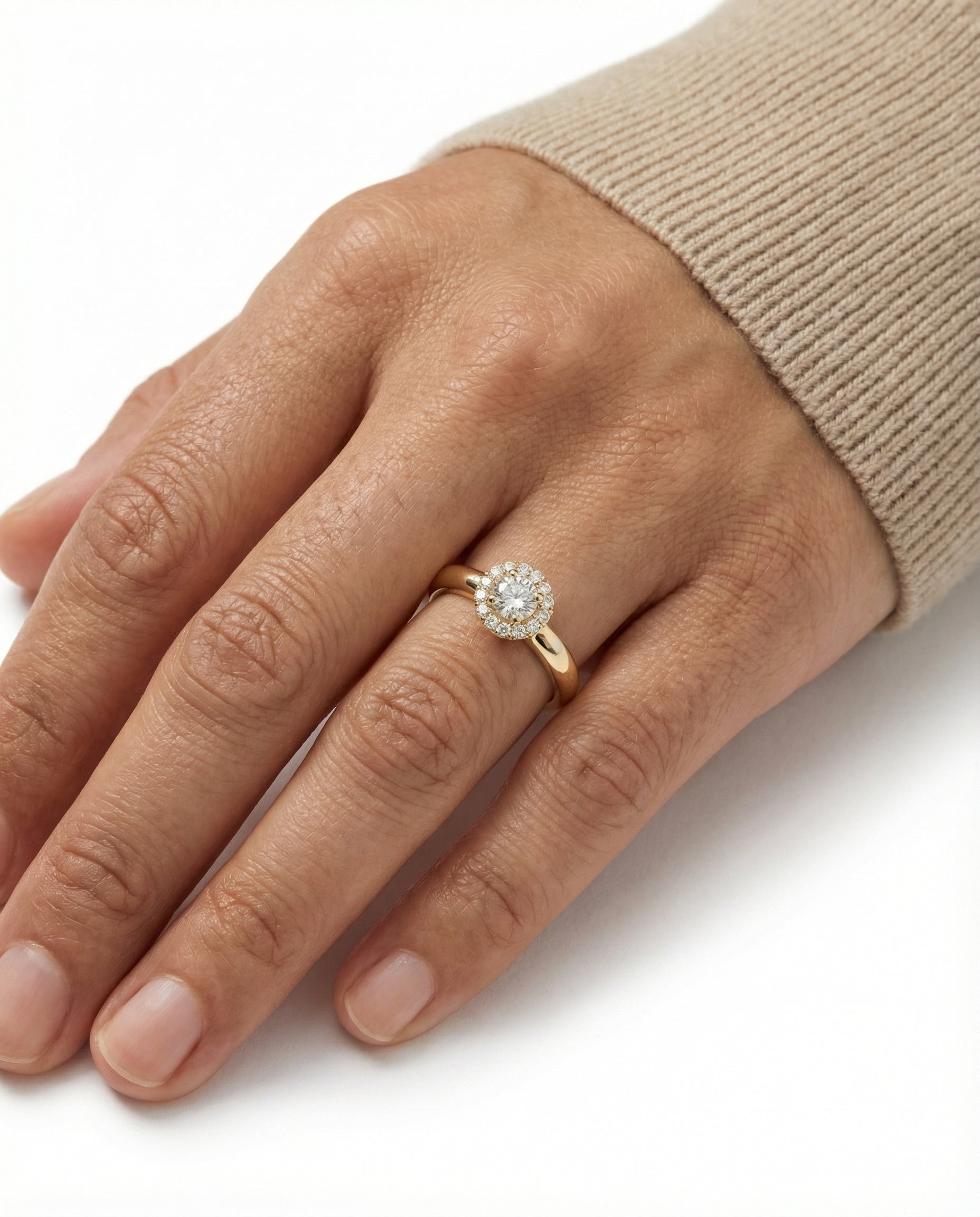 Model: Haloring i 14K guld med diamanter (0.47 ct), Str. 48